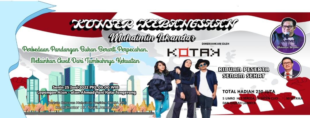 Jangan lewatkan momen dan kesempatan kemeriahan Konser Kebangsaan Muhaimin yang akan di hadiri Kotak Band dan Ribuan peserta senam sehat dengan hadiah atau Door Prize dengan yang sangat pantastis yaitu 250 juta rupiah ” Tutup Tasril Jamal.