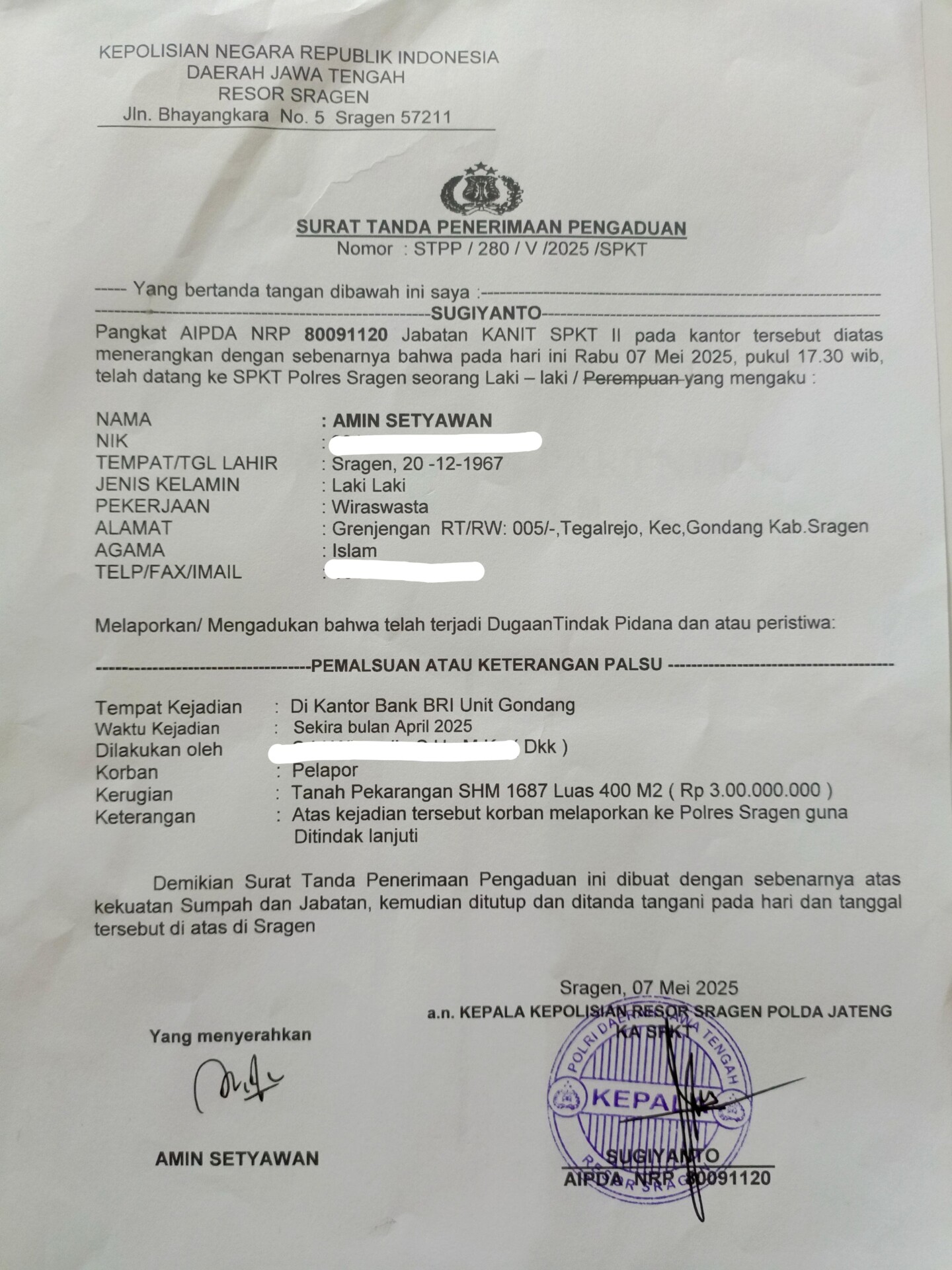Sragen – Aksi kejahatan mafia tanah kembali terjadi di wilayah Sragen. Kali ini yang menjadi korban mafia tanah yakni AMIN, warga Tegalrejo Gondang, berikut faktanya :