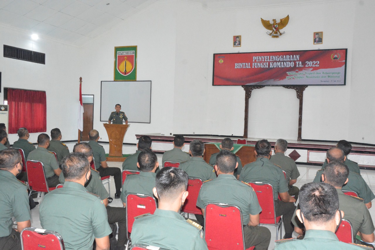 Bintal Fungsi Komando Tahun 2022 bertemakan “Membangun Prajurit dan Keluarga yang Religius, Nasionalis dan Militansi”, disampaikan oleh Mayor Arm Hidayat Romadon (Pasi Puanter Staf Ter Rem 071/Wijayakusuma) dengan materi Pokok-pokok Penyelenggaraan Bintal Fungsi Komando (BFK), yang diikuti para Pasi dan Danramil perwakilan Kodim jajaran Korem 071/Wijayakusuma.
