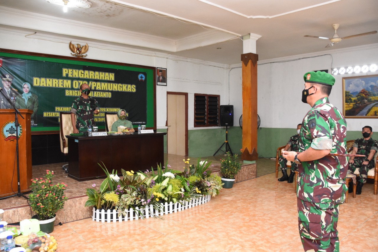 Kebumen – Pelitakota.id Komandan Korem 072/Pamungkas (Danrem 072/Pmk) Brigjen TNI Afianto beserta Ketua Persit KCK Koorcab Rem 072 PD IV/Dip Ny. Rina Afianto melaksanakan kunjungan kerja (Kunker) ke Kodim 0709/Kebumen Jl. Merak No.1 Panjer Kec. Kebumen Kab. Kebumen. Rabu (24/11/21).