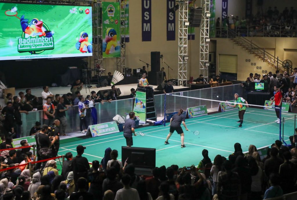 SEMARANG – Laga eksebisi menghadirkan atlet nasional yang kerap mengharumkan Indonesia di kancah internasional, mewarnai keseruan even Badminton Jateng Open 2024 di GOR USM Semarang, Senin (4/6/2024) malam. Peraih medali emas Olimpiade Rio de Janiero 2016 Tontowi Ahmad, dan juara All England 2020 Melati Deava, tampil bareng aktor Joshua Suherman.