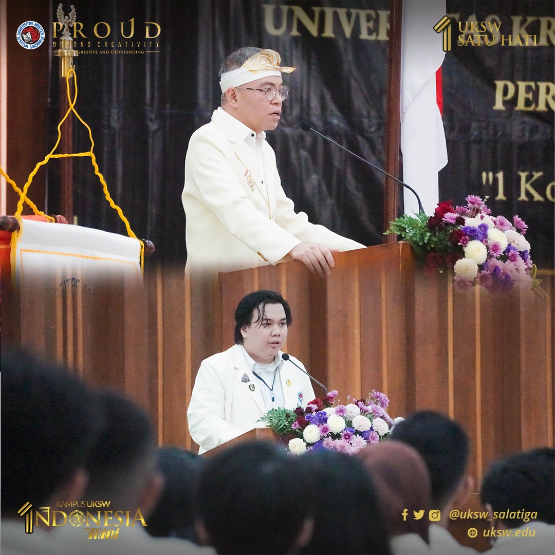 “Untuk pimpinan Lembaga Kemahasiswaan yang baru, Raja dan Meldy selamat bertugas memimpin kurang lebih lima belas ribu mahasiswa yang ada di UKSW, ini tugas luar biasa bagi kalian berdua,” kata Rektor.