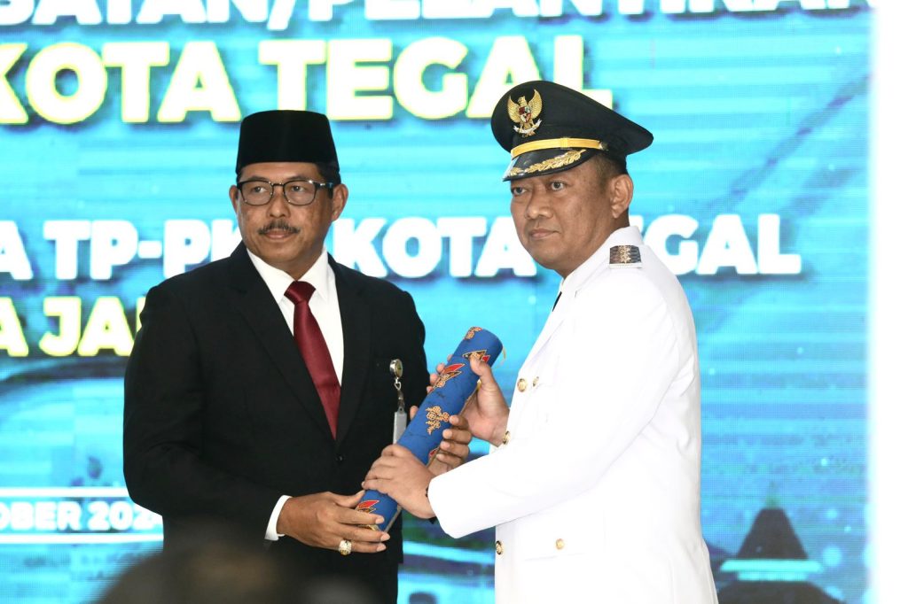SEMARANG – Penjabat (Pj) Gubernur Jawa Tengah Nana Sudjana melantik Agus Dwi Sulistyantono sebagai Penjabat Wali Kota Tegal, di Gedung Wisma Perdamaian, Senin (21/10/2024). Kepada Agus, Nana menginstruksikan menekan angka inflasi dan menurunkan prevalensi stunting.