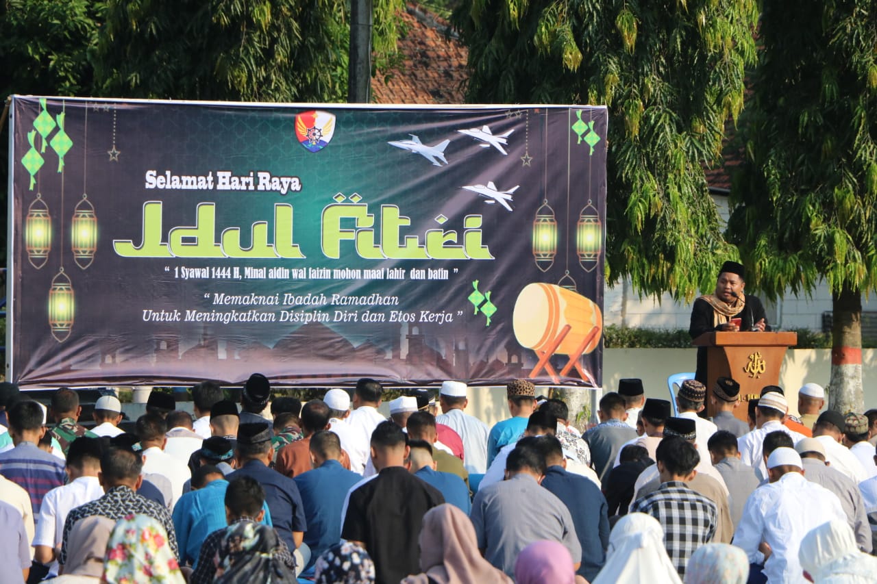 Dihadapan para jamaah yang hadir Komandan Lanud Iswahjudi Marsma TNI Irwan Pramuda, S.E., M.M., mengucapkan selamat Idul Fitri 1 syawal 1444 Hijriah, taqabbalallaahu minna wa minkum, mohon maaf lahir dan batin, dengan harapan dan doa semoga ibadah puasa yang telah kita laksanakan selama sebulan penuh, mampu memberikan kekuatan baru dalam menghadapi tugas-tugas kita selanjutnya.