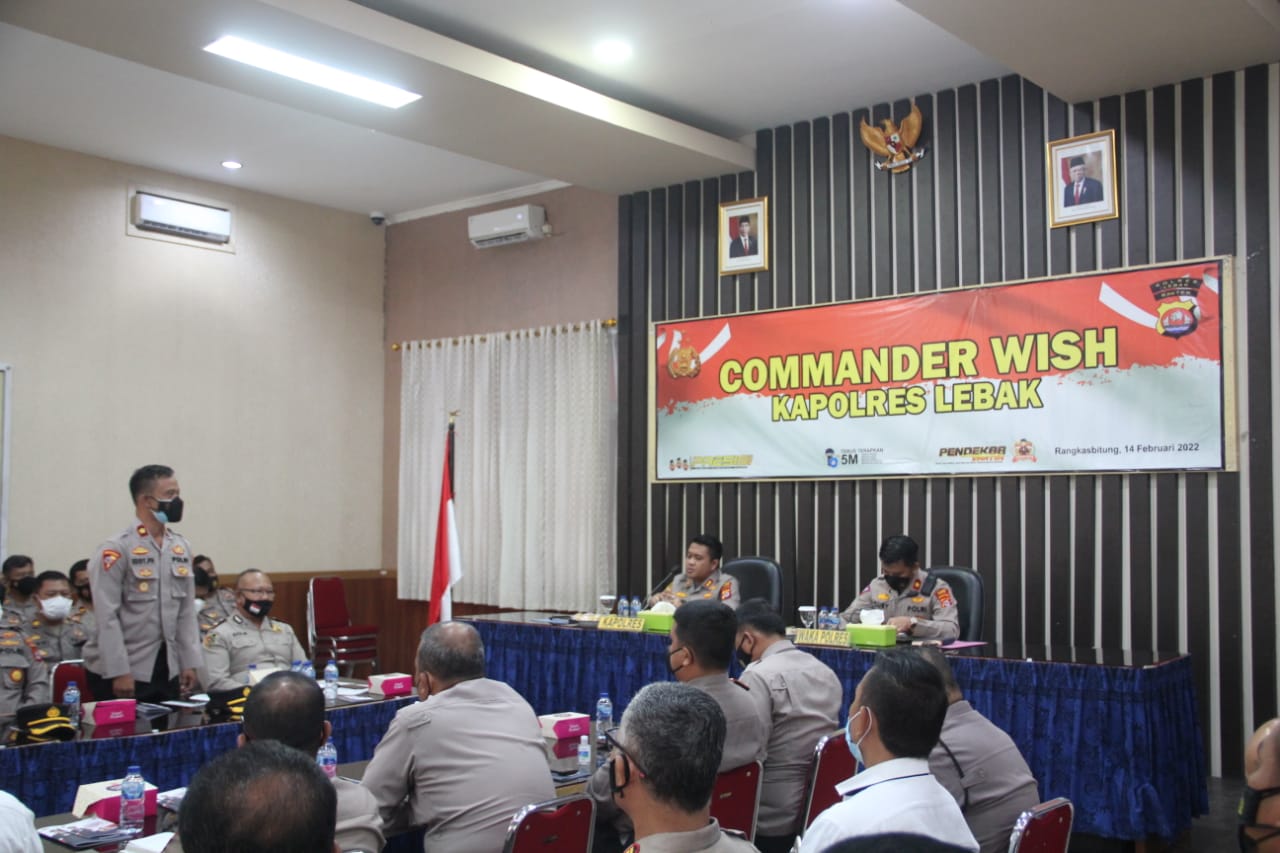LEBAK | Kapolres Lebak AKBP Wiwin Setiawan, S.IK., MH yang didampingi oleh Waka Polres Lebak Kompol Roby Hery Saputra SH, SIK, MH, Melaksanakan Arahan Program Kerja Commander Wish Unggulan Polres Lebak, yang diikuti Oleh para PJU Polres Lebak, Perwira Polres dan Seluruh Kapolsek Jajaran Polres Lebak, di Aula Polres Lebak, Pada Senin (14/02/2022)