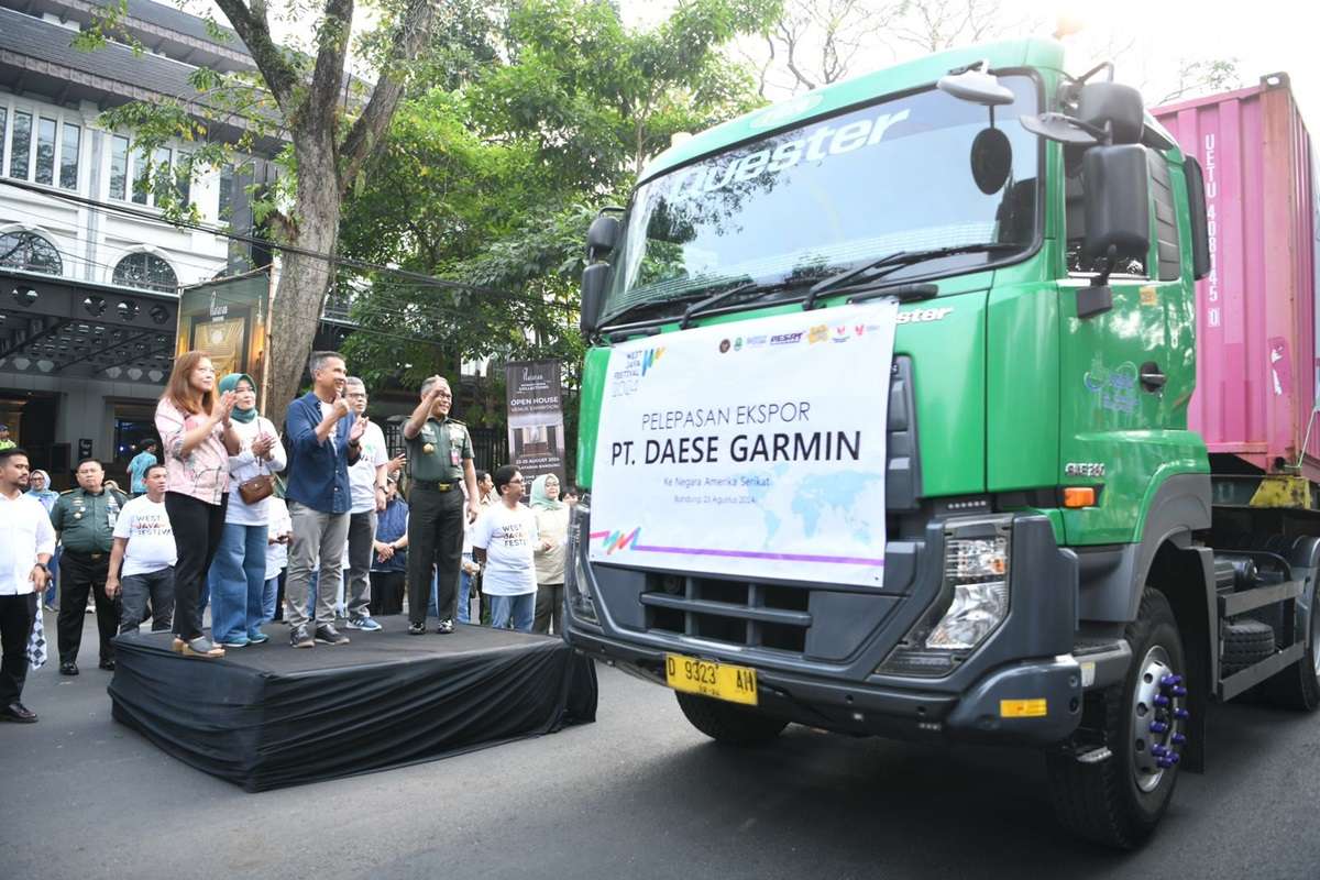 KOTA BANDUNG – Penjabat (Pj.) Gubernur Jawa Barat Bey Machmudin melepas ekspor garmen PT Daese Garmin ke Amerika Serikat di Jl. Diponegoro, Kota Bandung, Jumat (23/8/2024).