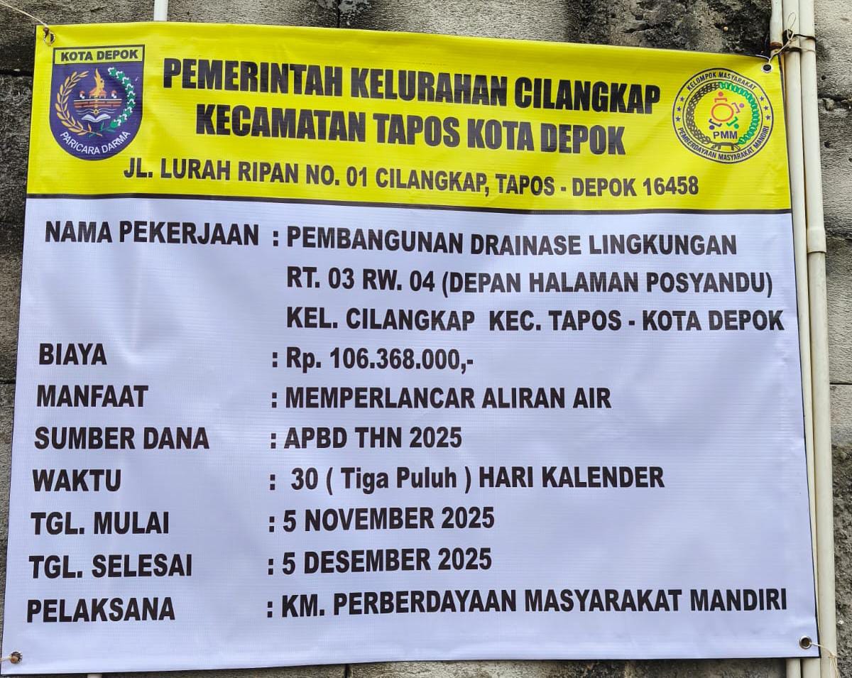 Depok, 19 November 2025_ Dugaan ketidakberesan proyek drainase Pokmas di RT 03 RW 04, Kelurahan Cilangkap, Kecamatan Tapos, Kota Depok, kembali menyeruak dan menempatkan Lurah Cilangkap, Galih Catur, dalam sorotan tajam. Proyek senilai Rp106.368.000 dari APBD 2025 itu bukan hanya dipertanyakan kualitasnya, tetapi juga mempertontonkan lemahnya kontrol pejabat kelurahan.