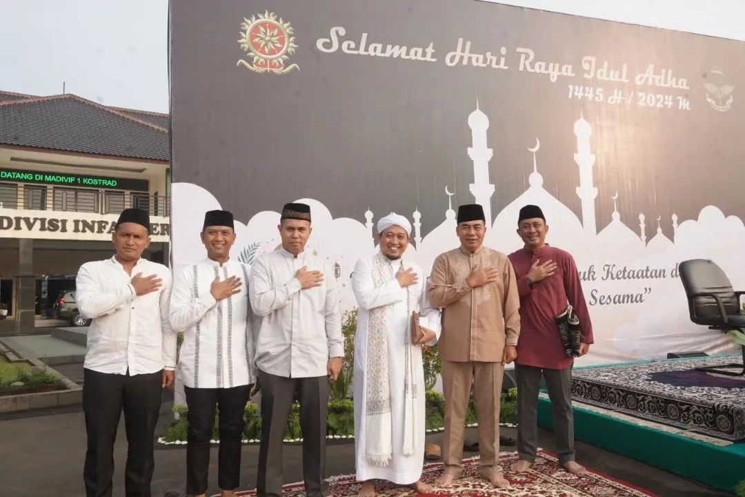 DEPOK – Panglima Divisi Infanteri (Pangdivif) 1 Kostrad Mayjen TNI Rudi Puruwito, S.E., M.M, didampingi oleh Ibu Ketua Persit Kartika Chandra Kirana Koorcab Divif 1 PG Kostrad Ny. Agustin Rudi Puruwito beserta para pejabat utama Divif 1 Kostrad melaksanakan sholat Idul Adha 1445 H/2024 M bersama Prajurit dan warga yang berada disekitar asrama Madivif 1 Kostrad bertempat di Lapangan Hitam Divif 1 Kostrad, Kec. Cilodong, Kota Depok Jawa Barat. Senin (17/06/2024).