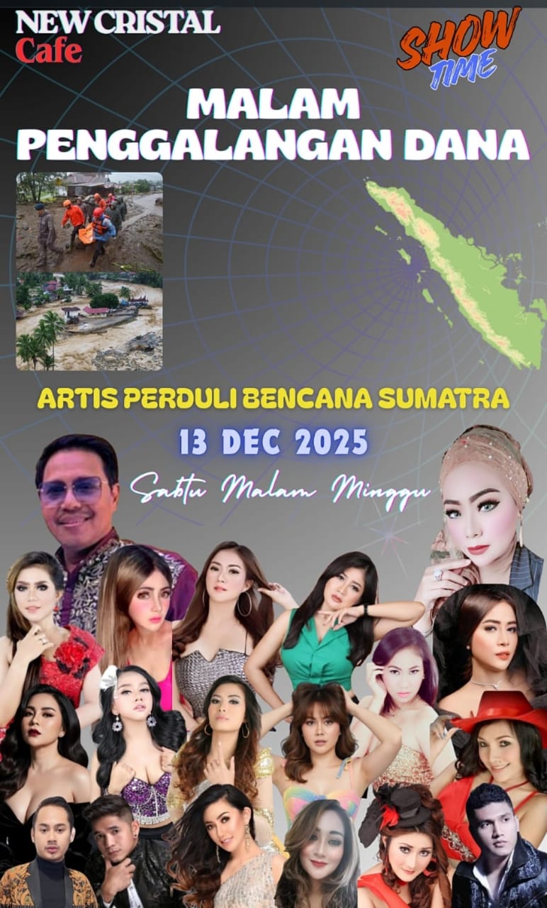 Jakarta – Gelapnya malam Sabtu 13 Desember 2025 akan terisi cahaya solidaritas. Di New Cristal Cafe Bar & Life Music, Jalan Raya Bogor No.112 Km 26,5 Ciracas Jakarta Timur (tepat di atas Resto Padang Sederhana depan Polsek Pasar Rebo), Cristal Cafe bersama para artis akan menggelar “Malam Solidaritas Penggalangan Dana Untuk Sumatra” – bertujuan membantu korban banjir bandang dan longsor di Aceh, Sumatra Utara (Sumut), dan Sumatra Barat (Sumbar).