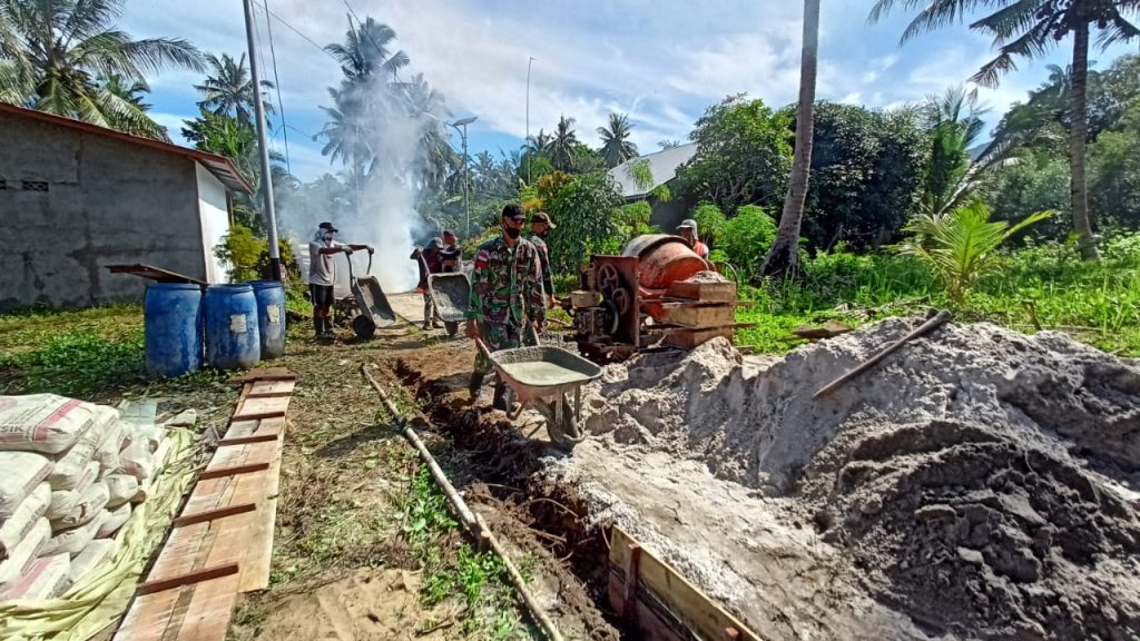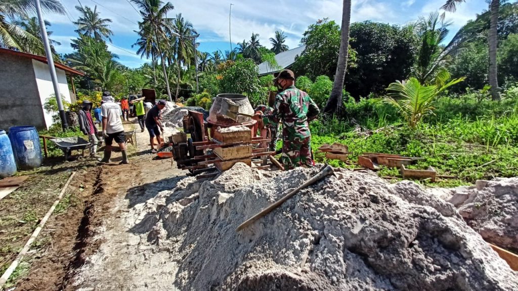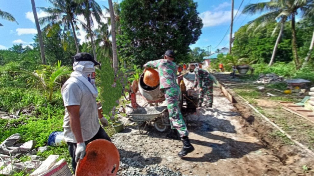 Sambas, Kalbar – Jalin kemanunggalan dengan masyarakat perbatasan, Satgas Pamtas Yonif Mekanis 643/Wns membantu membangun jalan desa di Dusun Maludin, Desa Temajuk, Kec. Paloh, Kab. Sambas.