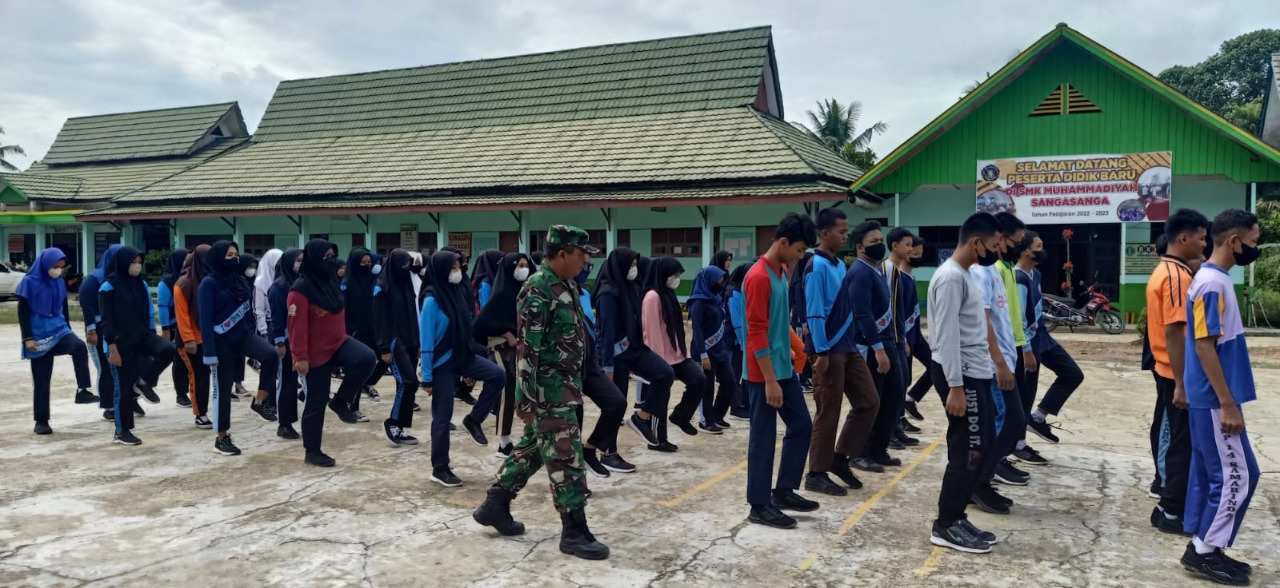 Kutai Kartanegara – Para Babinsa Koramil 0906-04/Sanga-sanga Kodim 0906/Kutai Kartanegara (Kkr) diterjunkan untuk berperan serta dalam pelatihan PBB dan pembekalan wawasan kebangsaan bagi para peserta didik baru yang memasuki Tahun Pelajaran 2022/2023, Senin (18/7/2022).