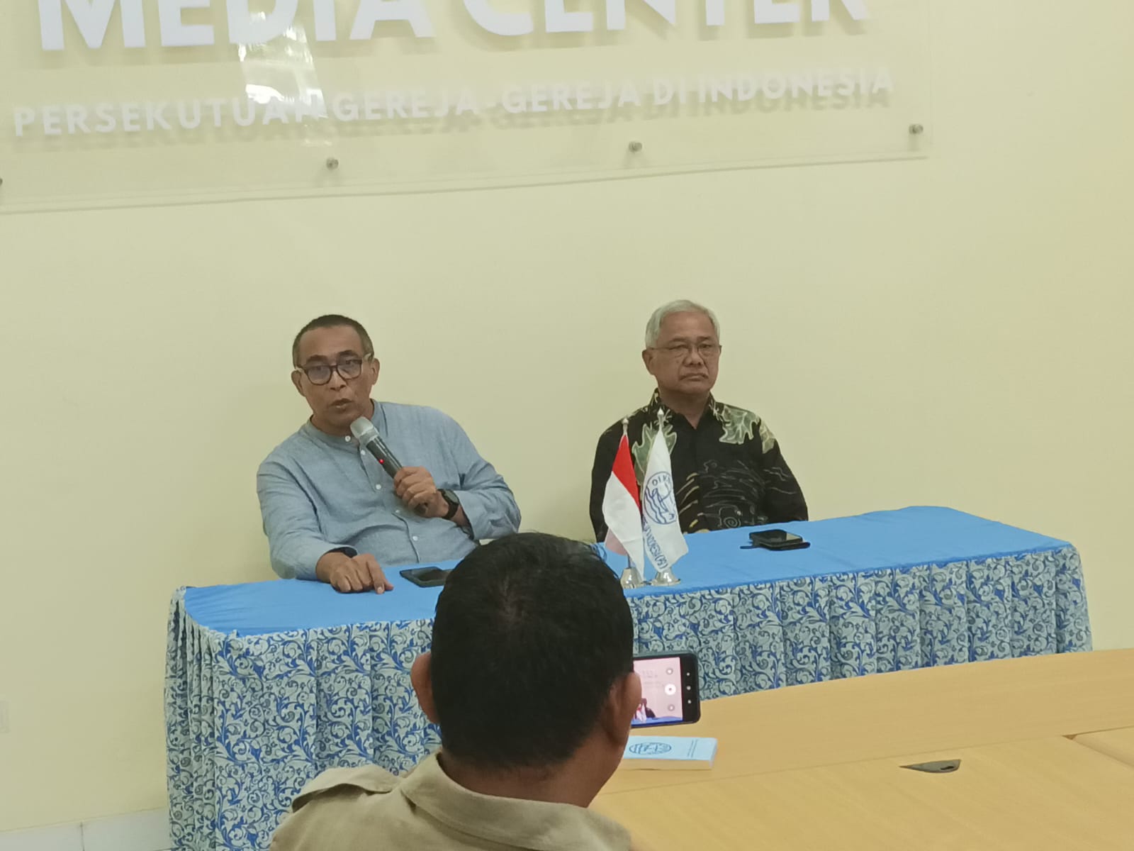 Pendeta Musa Salusu bersama Pdt Jackelyn Manuputy sekretaris umum PGI dalam komprensi persnya yang di gelar di media center PGI di depan para awak media.