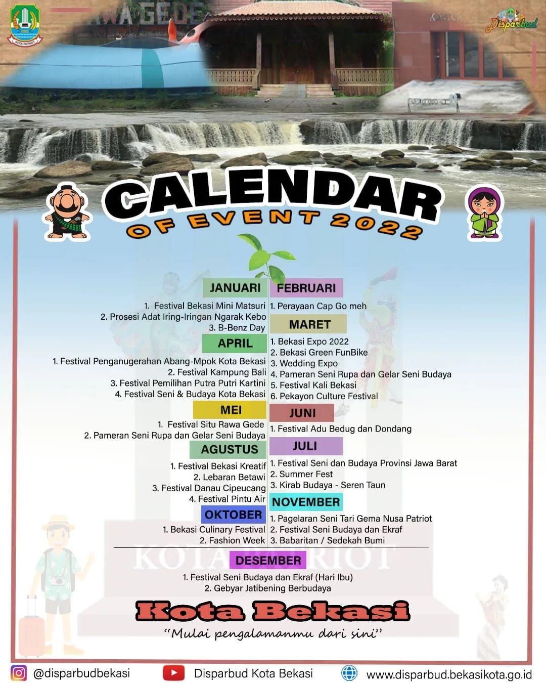 Kota Bekasi – Pemerintah Kota Bekasi melalui Dinas Pariwisata dan Budaya (Disparbud) Kota Bekasi mengeluarkan kalender event tahun 2022. Disparbud berharap masyarakat mengetahui penyelenggaraan event atau festival yang ada di Kota Bekasi melalui kelender tersebut sehingga masyarakat dapat mengeksplorasi pariwisata dan seni budaya yang ada di Kota Bekasi.