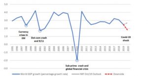 Grafik di atas adalah grafik World (Gross Domestic Product) Growth atau Pertumbuhan Produk Domestik Bruto Dunia, yang umumnya dipakai untuk menilai pertumbuhan ekonomi dunia. Perkembangan ekonomi di dunia tidak selalu naik konsisten dari tahun ke tahun. Bukan seperti tangga, yang makin lama makin bertambah tinggi. Tapi justru hanya seperti grafik naik dan turun. Sebagai contoh, tahun 1999-2000 terlihat sebagai tahun dimana pertumbuhan ekonomi begitu baik, tapi di tahun 2001 terlihat ekonomi menurun. Tahun 2006-2007 ekonomi terlihat stabil dan baik, tapi di tahun 2008-2009 ada penurunan tajam dalam perekonomian, terjadi krisis.