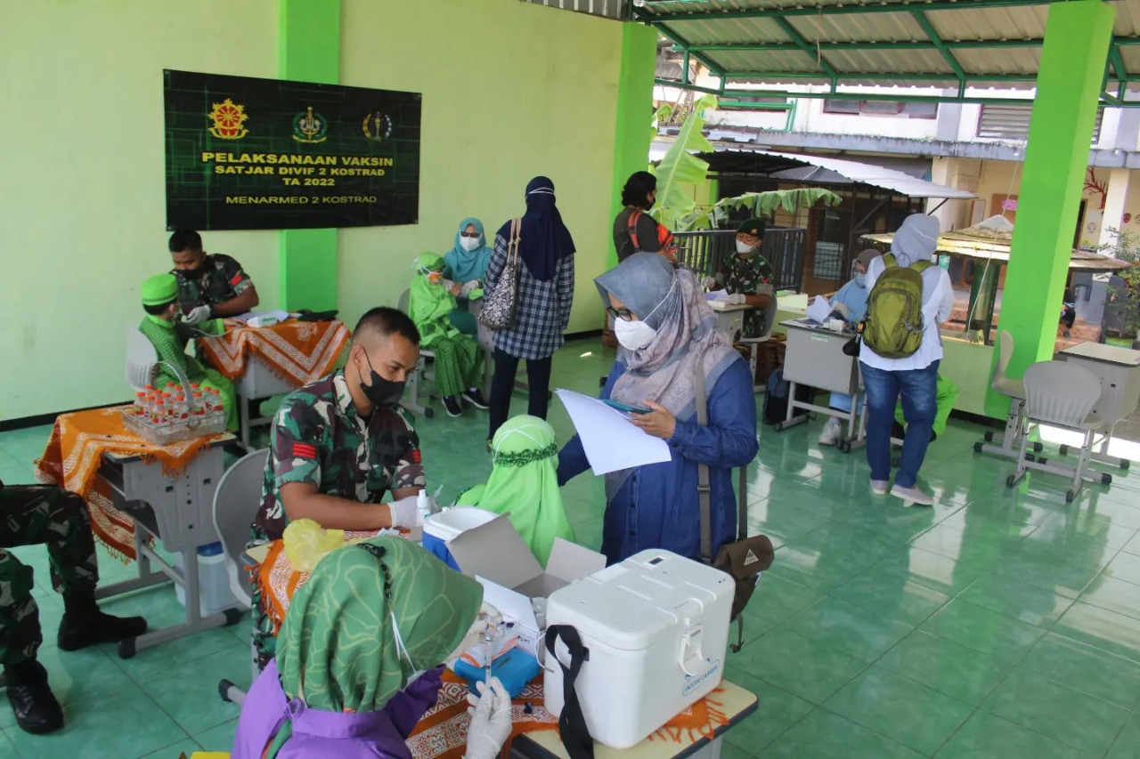 Malang – Guna mendukung program Pemerintah dalam penanggulangan Pandemi Covid-19, Menarmed 2 Kostrad berperan aktif bersama Pemerintah pelaksanaan kegiatan Serbuan Vaksin tahap 2 Covid-19 untuk anak umur 6 sampai 11 tahun yang diselenggarakan di SDIT Ahmad Yani Malang pada hari. Kamis (03/02/2022).