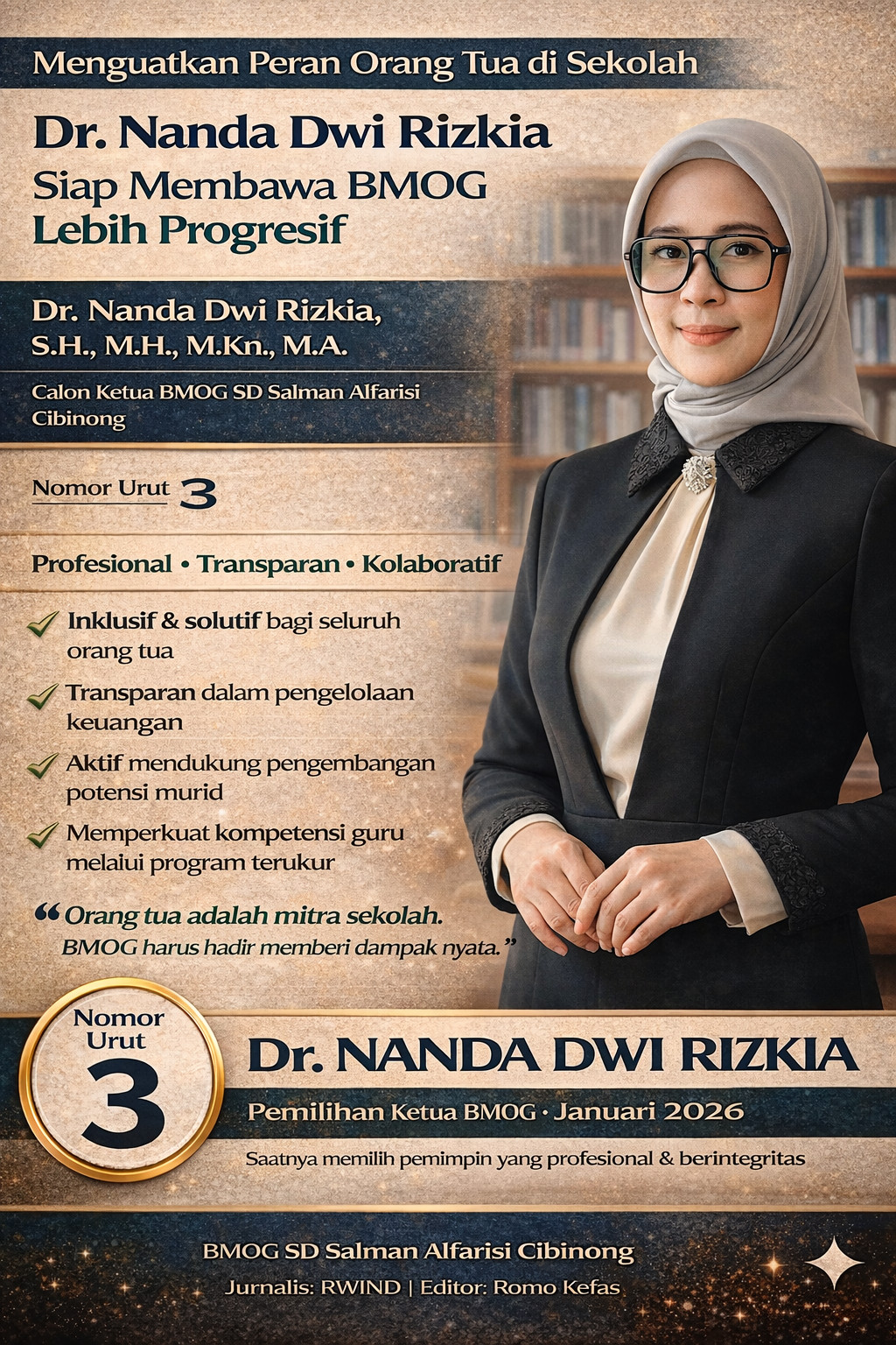 Cibinong — Badan Musyawarah Orang Tua dan Guru (BMOG) bukan sekadar forum formal antara wali murid dan sekolah. Di tangan yang tepat, BMOG dapat menjadi motor penggerak kolaborasi, transparansi, dan kemajuan pendidikan. Visi inilah yang diusung Dr. Nanda Dwi Rizkia, SH, MH, M.Kn, MA saat menyatakan kesiapan maju sebagai Ketua BMOG SD Salman Alfarisi Cibinong dengan nomor urut 3.