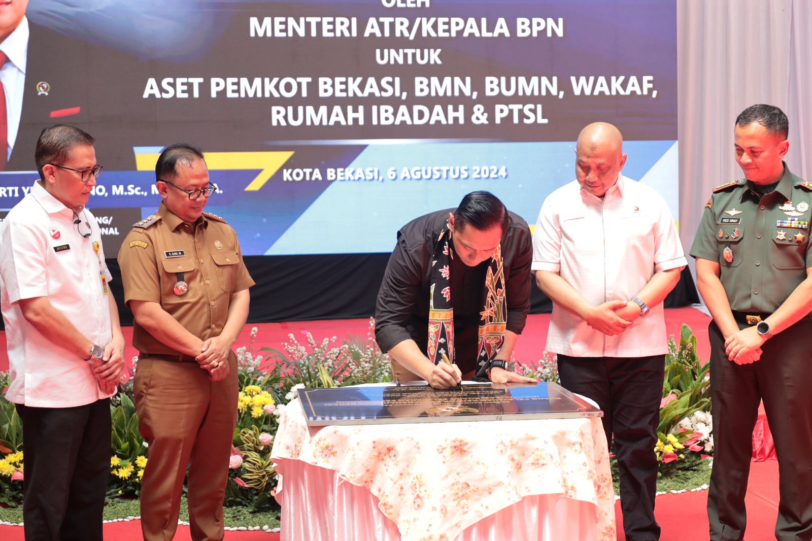 Kota Bekasi – Menteri Argaria dan Tata Ruang (ATR)/Kepala Badan Pertanahan Nasional (BPN), Agus Harimurti Yudhoyono (AHY) menyambangi Kantor Pertanahan (Kantah) Kota Bekasi guna memberikan Sertifikat Eletronik untuk Aset Tanah milik Pemerintah, BMN, BUMN, Wakaf, Rumah Ibadah, dan PTSL di Kota Bekasi pada Selasa (06/08)