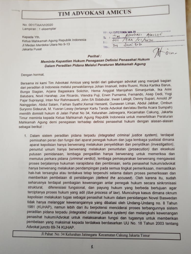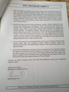 Kami Tim Advokasi Amicus Yang Terdiri Dari Gabungan advokat Yang Menjadi Bagian Dari Peradilan di Indonesia melalui perwakilannya Johan Imanuel, Indra Rusmi, Ricka Kartika Barus, Bunga Siagian, Arjana Bagaskara Solichin, Hema Anggiat Marojahan Simanjuntak, Ika Arini Batubara, Novli Harahap, Joe Ricardo, Wendra Puji, Erwin Purnama, Fernando, Asep Dedi, Yogi Pajar Suprayogi, Intan Nur Rahmawanti, John SA Sidabutar, Irwan Lalegit, Denny Supari, Arnold JP Nainggolan, Abdul Salam, Farhan Syathir, Kemal Hersanti, Gunawan Liman, Abdul Jabbar, Ombun Suryono Sidauruk, M. Yusran Lessy (terlampir Kartu Tanda Advokat Dan / ATAU Berita Acara Sumpah) meminta ditunjukan kepada Ketua Mahkamah Agung Republik Indonesia untuk ditinjau