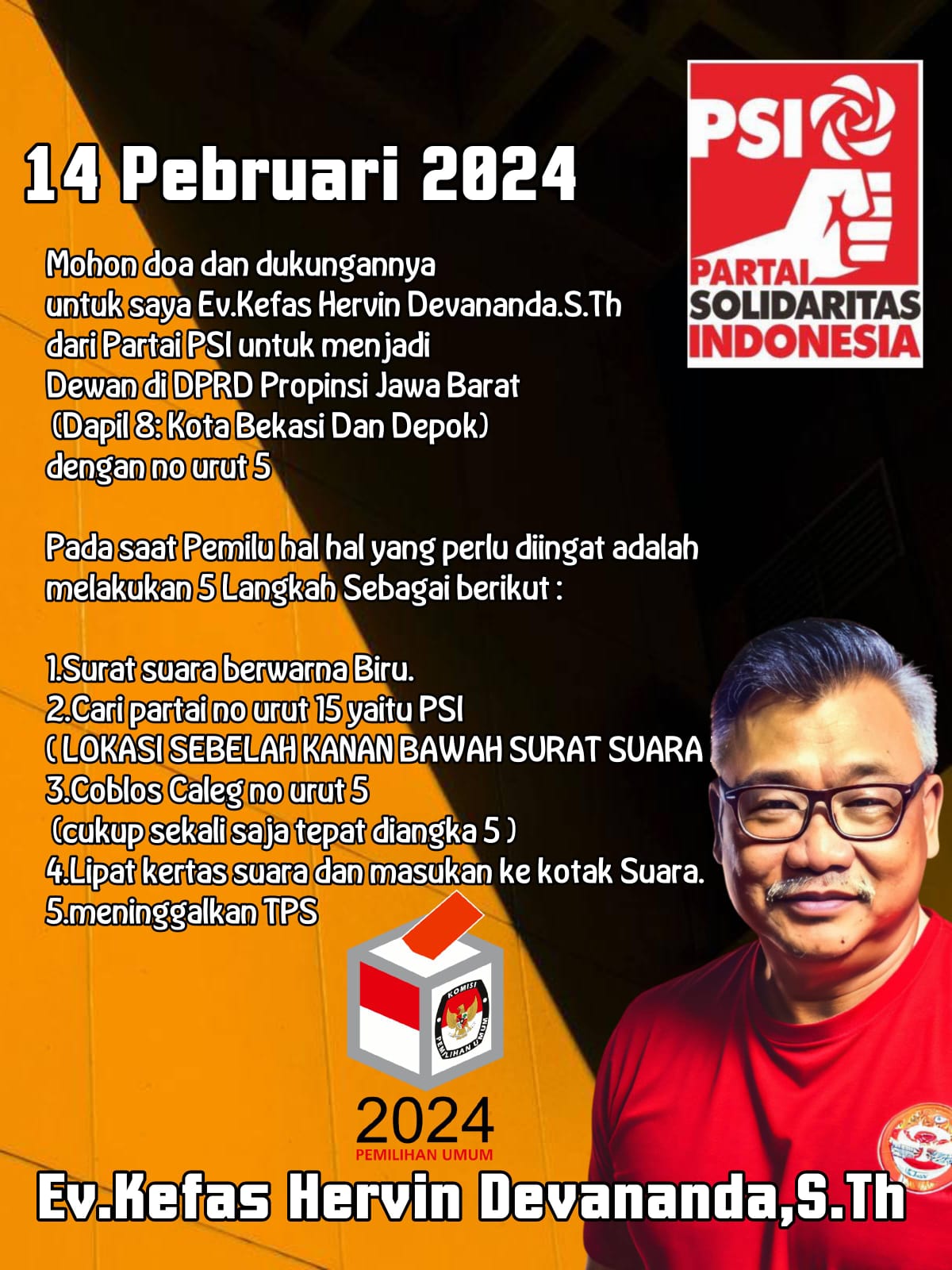 Kota Bogor – Kefas Hervin Devananda,STh salah Seorang Caleg DPRD Propinsi Jawa Barat dari Partai Solidaritas Indonesia Dapil kota Bekasi dan Depok nomor Urut 5, yang aktivis dan Jurnalist senior berharap Pers dapat menjunjung tinggi independent menjelang pemilu 2024 yang akan berlangsung pada 14 Februari mendatang.