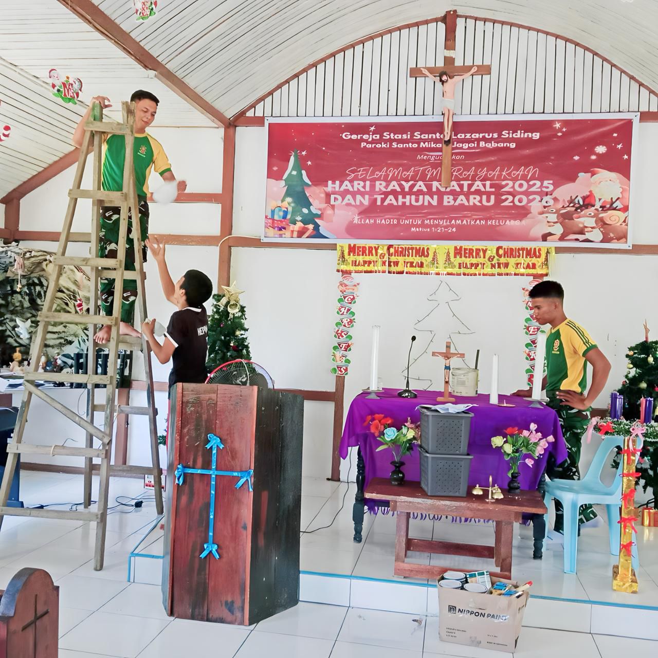 Siding, 23 Desember 2025 — Bukan hanya menjaga keamanan perbatasan, Satgas Pamtas RI–Malaysia Yonarhanud 1 Kostrad Pos Gunung Anggas juga menunjukkan wajah kepedulian sosial dan keagamaan yang mengesankan! Pada hari Senin, 19 Desember 2025, mereka langsung turun tangan memberikan sargal berupa kipas angin, cat, dan hiasan natal, serta membantu dekorasi Gereja St. Lazarus Siding guna menyambut Natal 2025 yang penuh makna.