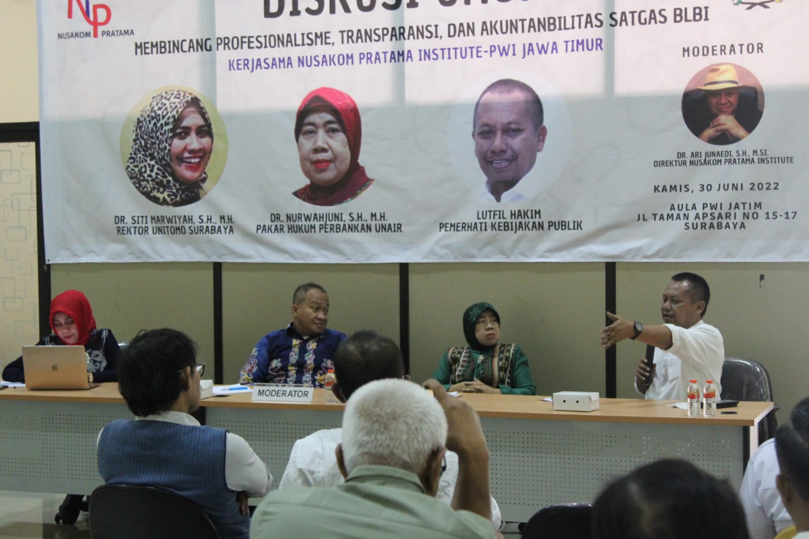 Acara yang digelar Kamis (30/6) di Aula PWI Jawa Timur, Jalan Taman Apsari No 15-17 Surabaya tersebut menghadirkan tiga narasumber, masing-masing; Dr. Siti Marwiyah, S.H., M.H. (Pakar Hukum Tata Negara sekaligus Rektor Universitas Dr. Soetomo Surabaya), Dr. Nurwahjuni, S.H., M.H. (Pakar Hukum Perbankan Universitas Airlangga Surabaya), dan Lutfil Hakim (pengamat kebijakan publik yang juga Ketua PWI Jawa Timur).