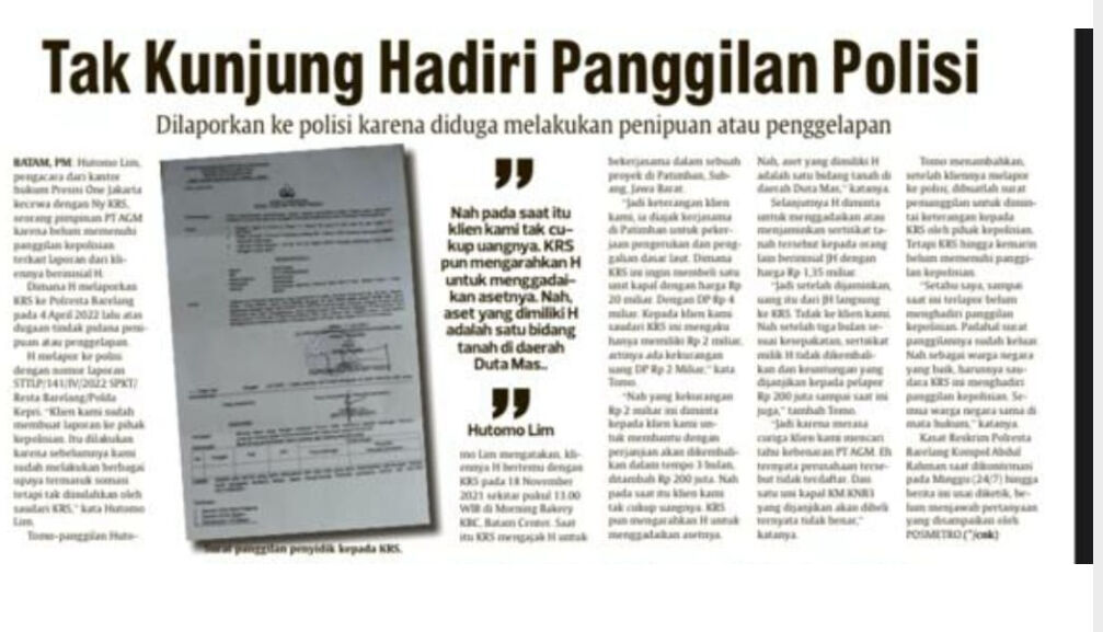 Hendra Sunarya sebagai kliennya korban dari Ny.KRS dugaan Penipuan ,Hutomo sebagai kuasa hukum menyatakan dirinya merasa sangat kecewa dengan sikap Ny.KRS, yang mengaku sebagai istri dari seorang Perwira aktif TNI dan mengaku sebagai seorang Pimpinan PT. AGM yang awalnya mengatakan mempunyai Proyek besar dalam pengerjaan pengerukan dan penggalian dasar laut di Patimban Subang, Jawa Barat itu ternyata tidak benar dan langsung sulit ditemui setelah mendapatkan uang hasil menggadaikan sertifikat tanah milik Hendra, dan bahkan ketika kami investigasi atas nama Perusahaan PT.AGM itu tidak terdaftar disana jelasnya.