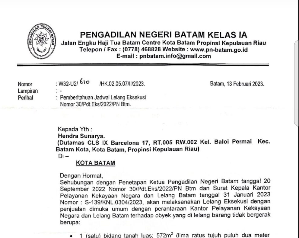 Perlu diketahui sebagai korban Hendra Sunarya Warga Batam dirinya diketahui mendapatkan Surat Pemberitahuan dari Pengadilan Negeri Batam Kelas 1A – Nomor : W32-U2/610/HK.02.05.07/II/2023, menyatakan jadwal Lelang Eksekusi Nomor 30/Pdt.Eks/2022/PN Btm, Tanah nya yang bertempat di Dutamas CLS IX Barcelona 17 Batam akan di Lelang oleh Balai Lelang atas Perintah Pengadilan Negeri Batam dan atas dilelang nya tanah ini Hendra mengalami kerugian sebesar 3 Miliar.