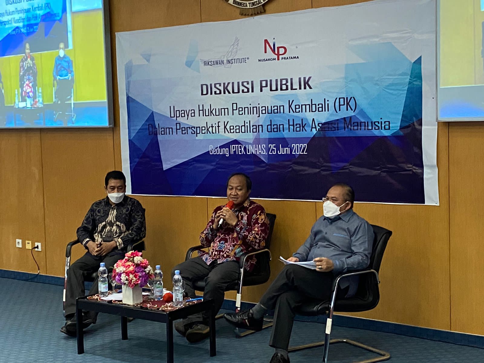 Dalam acara yang digelar di Gedung IPTEK Kampus Universitas Hasanudin, Tamanlarea, Makassar, Sulawesi Selatan, Sabtu (25/6), dua narasumber yang dihadirkan, masing-masing Prof. Dr. Aswanto, S.H., M.H, DFM (Wakil Ketua Mahkamah Konstitusi yang juga Guru Besar Fakultas Hukum Universitas Hasanuddin) dan Prof. Dr. Judhariksawan, S.H, M.H (Guru Besar Fakultas Hukum Universitas Hasanuddin yang juga Ketua Komisi Penyiaran Independen periode 2013-2016), mengupas tuntas kajian yuridis mengenai upaya hukum PK tersebut.