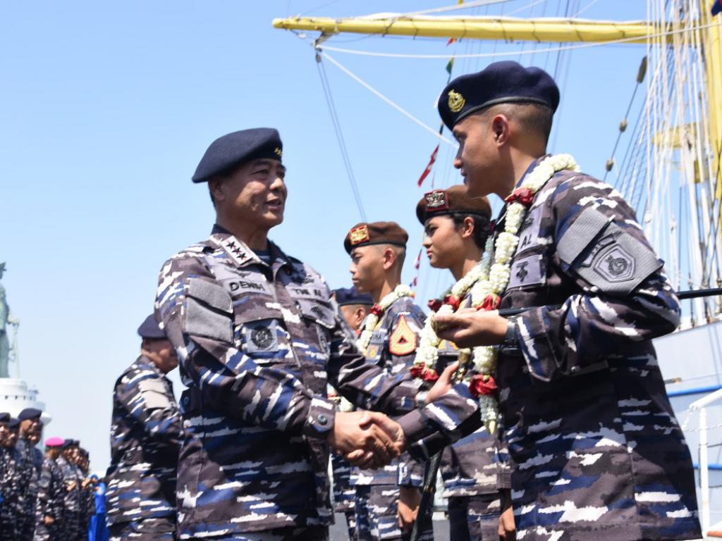 Surabaya – Panglima Komando Armada RI Laksamana Madya TNI Dr. Denih Hendrata, S.E., M.M., CHRMP., memimpin upacara penyambutan Kapal Latih TNI Angkatan Laut KRI Bima Suci setelah menyelesaikan misi diplomasi dan muhibah duta bangsa, dalam rangka mendukung Latihan Praktek (Lattek) Pelayaran Kartika Jala Krida (KJK) Taruna Akademi Angkatan Laut (AAL) Angkatan ke-71 Tahun 2024, bertempat di Dermaga Madura, Ujung, Surabaya, Rabu (30/10/2024).