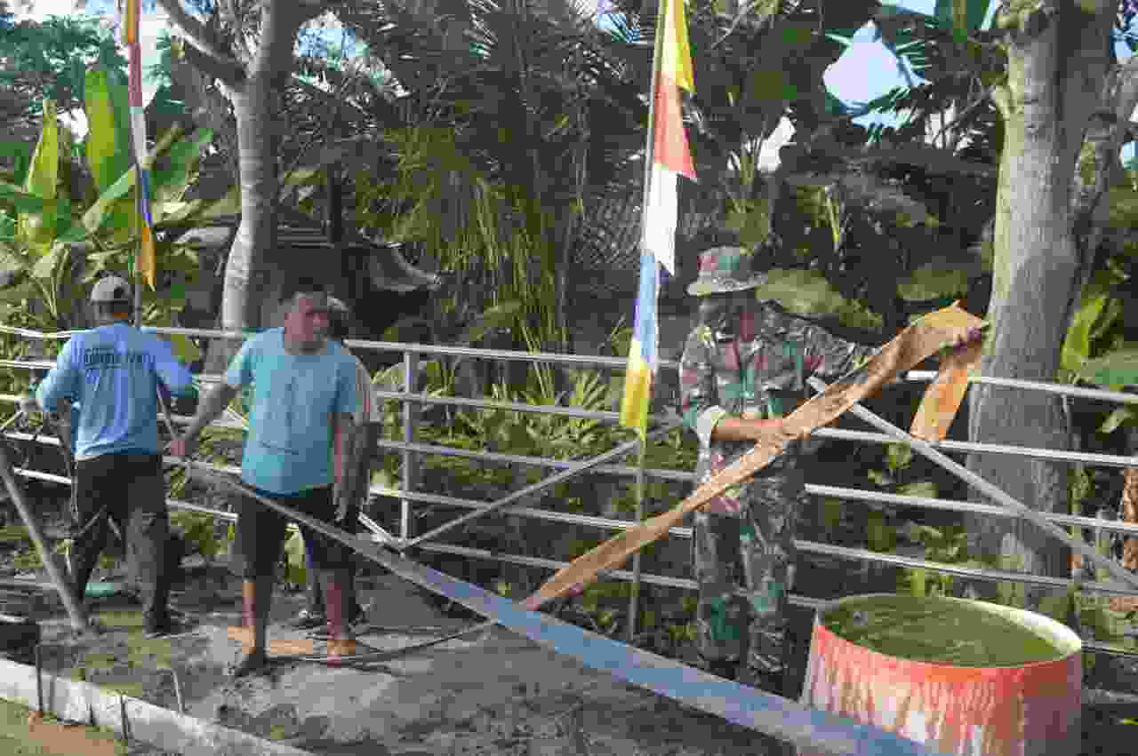 Personil satgas TMMD Kodim 0724/Boyolali Sertu Edy S bersama warga tengah menyiapkan selang untuk penyaluran Air sebagai salah satu penunjang untuk pengecoran jalan yang fungsinya untuk menyatukan semen dan pasir dan bahan lainnya sehingga bisa tercampur dan campuran semen dan material akan lebih kuat. Slamet ( 42 ) warga Desa Jerukan Kecamatan Juwangi sangat senang karena telah di bantu dalam pelaksanaan pemasangan selang Air dikarenakan pengambilan sumber airnya agak lumayan jauh semoga dapat membantu proses kelancaran pengecoran.