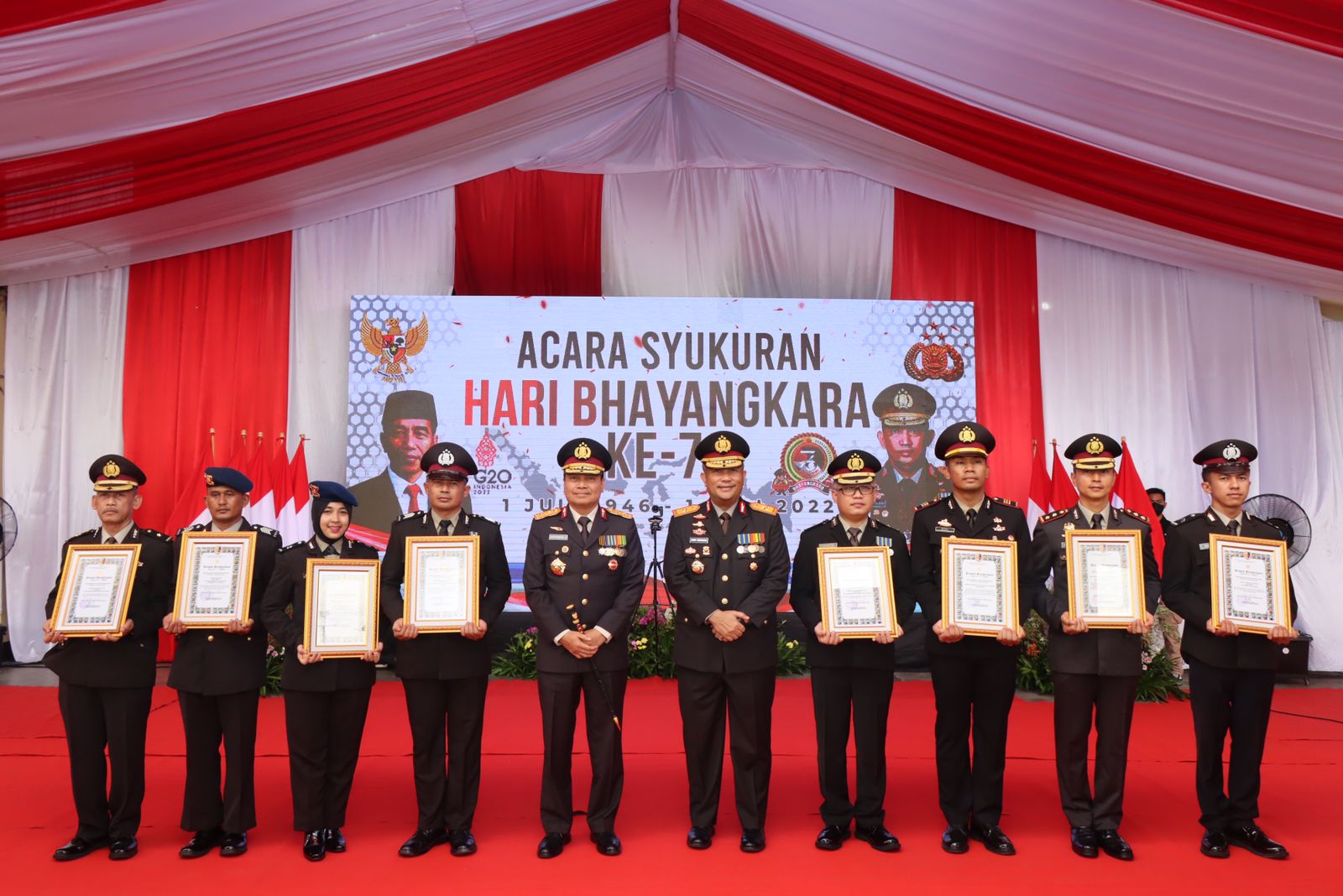 Sintang,Kalbar-Kapolda Kalimantan Barat, Irjen Pol. Drs. Suryanbodo Asmoro, M.M, memberikan penghargaan kepada sejumlah personel yang berprestasi pada peringatan Hari Bhayangkara ke-76, Selasa (6/7).