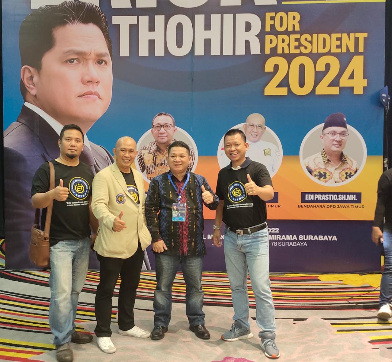 Dalam cara Deklarasi Nasional Erick Thohir for President 2024, tampak hadir Anshar Ilo Ketua Umum DPP Loyalis Erick Thohir (Letho) dan jajarannya, serta Edy Torana SH, MH, M.Kn, CLA Ketua DPD Letho Jawa Timur.