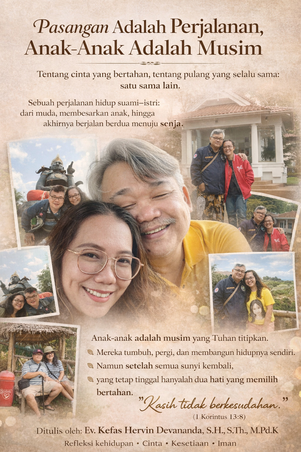 Dan pada akhirnya, ketika hidup telah memberi dan mengambil cukup banyak, kerinduan terdalam setiap pasangan menjadi sangat sederhana: tetap berdampingan sampai akhir. Berdampingan dalam doa. Berdampingan dalam diam. Berdampingan dalam sisa waktu yang Tuhan izinkan.