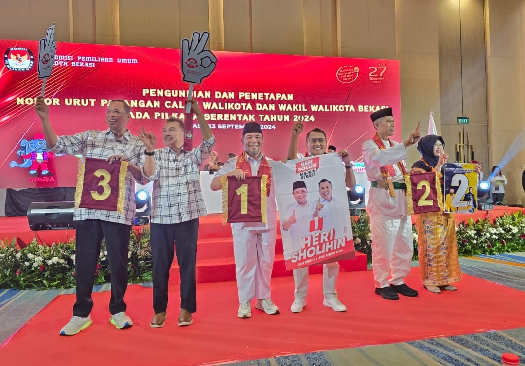Dan pasangan Calon Wali Kota Bekasi dan Wakil Wali Kota Bekasi, Tri Adhianto – Abdul Harris Bobihoe atau RIDHO mendapatkan nomor urut 3, dalam pengundian nomor urut, Pilkada Kota Bekasi 2024.