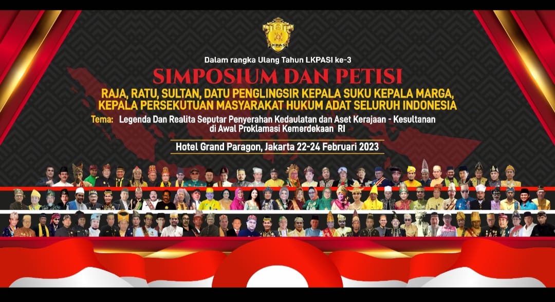 LKPASI akan mengadakan Simposium dan Petisi Raja Sultan Datu Penglingsir Kepala Suku Kepala Marga pemangku adat, Kepala Persekutuan Masyarakat Hukum Adat dalam rangka ULTAH ke-3 LKPASI yang mengambil tema “Legenda dan Realita Seputar Penyerahan Kedaulatan dan Aset Kerajaan Kesultanan di awal Proklamasi Kemerdekaan Republik Indonesia”, pada tanggal 22-24 Februari 2023, di Hotel Grand Paragon Jakarta. Demikian disampaikan via Watshap oleh Sekretaris Umum LKPASI, DYM.Puan Putri Reno Adat Negeri DR.Ruliah, SH., MH, yang berprofesi sebagai peneliti dan Dosen Hukum Adat Fakultas Hukum Univ.Halu Oleo KENDARI-SULTRA.