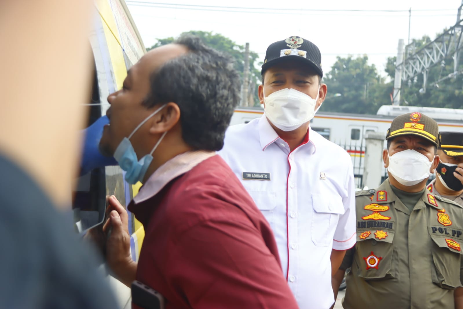 Kota Bekasi – Rabu, 2 Februari 2022 | Dalam rangka upaya pencegahan penyebaran wabah Covid-19, Pemerintah Kota Bekasi melakukan _tracking_ melalui swab antigen dan PCR di Stasiun Bekasi. Tri Adhianto, pelaksana tugas (Plt) Wali Kota Bekasi, melakukan monitoring secara langsung ke lokasi.