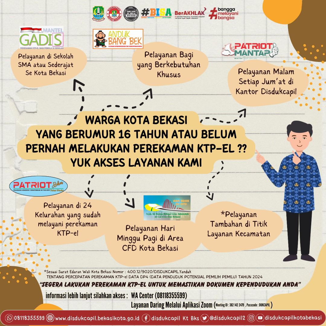 Sebagai upaya percepatan perekaman KTP-EL sekaligus dalam rangka mendorong jumlah pemilih pada Pemilihan Umum 2024, Pemerintah Kota Bekasi melalui Dinas Kependudukan dan Pencatatan Sipil (Disdukcapil) menggelar Layanan Tambahan di Kecamatan se- Kota Bekasi, yakni menambah dan memperpanjang jam layanan perekaman KTP-EL bagi pemula di setiap Kantor Kecamatan sesuai domisili masing-masing.