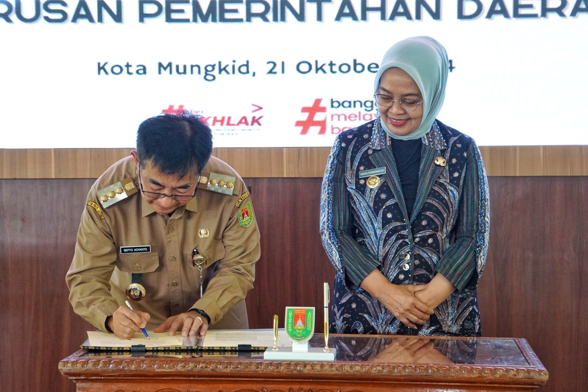 MAGELANG – Pj Bupati Magelang Sepyo Achanto menyampaikan apresiasi atas kepercayaan yang diberikan Pemerintah Kota Jambi dalam penandatanganan kesepakatan bersama di Pendopo Soepardi Setda Kabupaten Magelang, Senin (21/10/2024). Ia menegaskan kerja sama ini bertujuan untuk pengendalian inflasi, khususnya dalam pemenuhan pasokan komoditas cabai.
