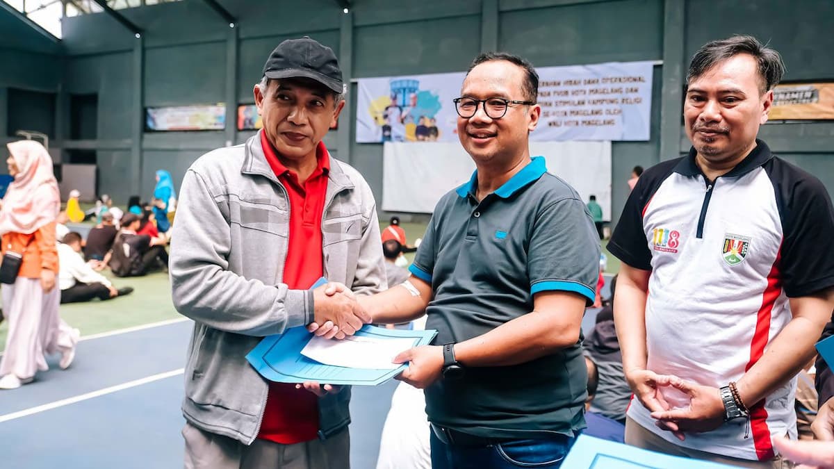 Wali Kota Magelang dr. Muchamad Nur Aziz didampingi Wakil Wali Kota Magelang KH. Mansyur dan Sekda Kota Magelang Hamzah Kholifi memberikan dana hibah tersebut di Lapangan Tenis Indoor Gelora Sanden, Jumat (7/6/2024).