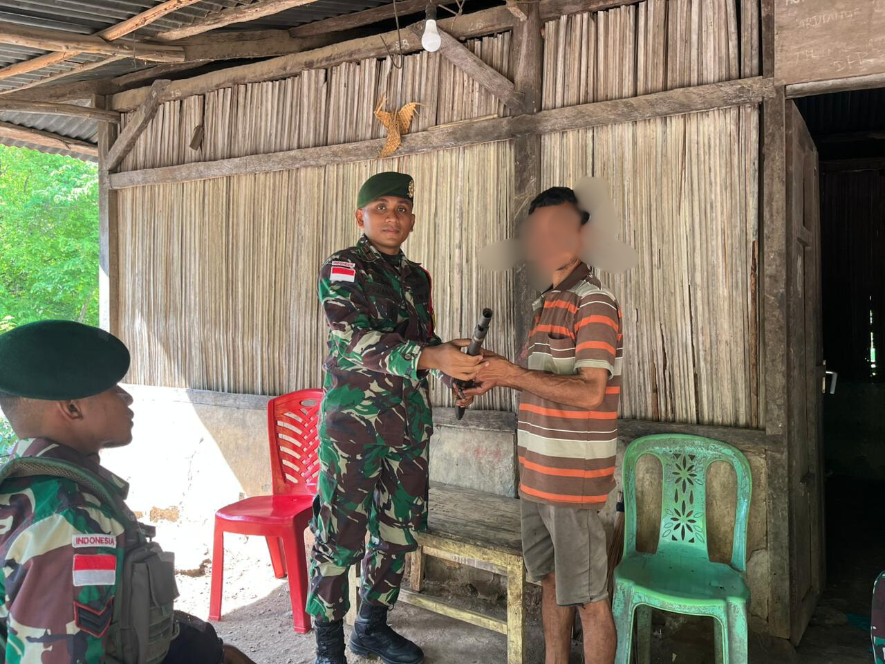 Manamas – Kepercayaan masyarakat perbatasan terhadap Satgas Pamtas RI-RDTL Sektor Barat Yonarhanud 2 Kostrad kembali bersemi. Seorang warga Desa Manamas, Kec. Naibenu, Kab. TTU, menyerahkan 1 pucuk senjata api sebagai bukti kedekatan dan kepercayaan yang terjalin, Minggu (30/11).