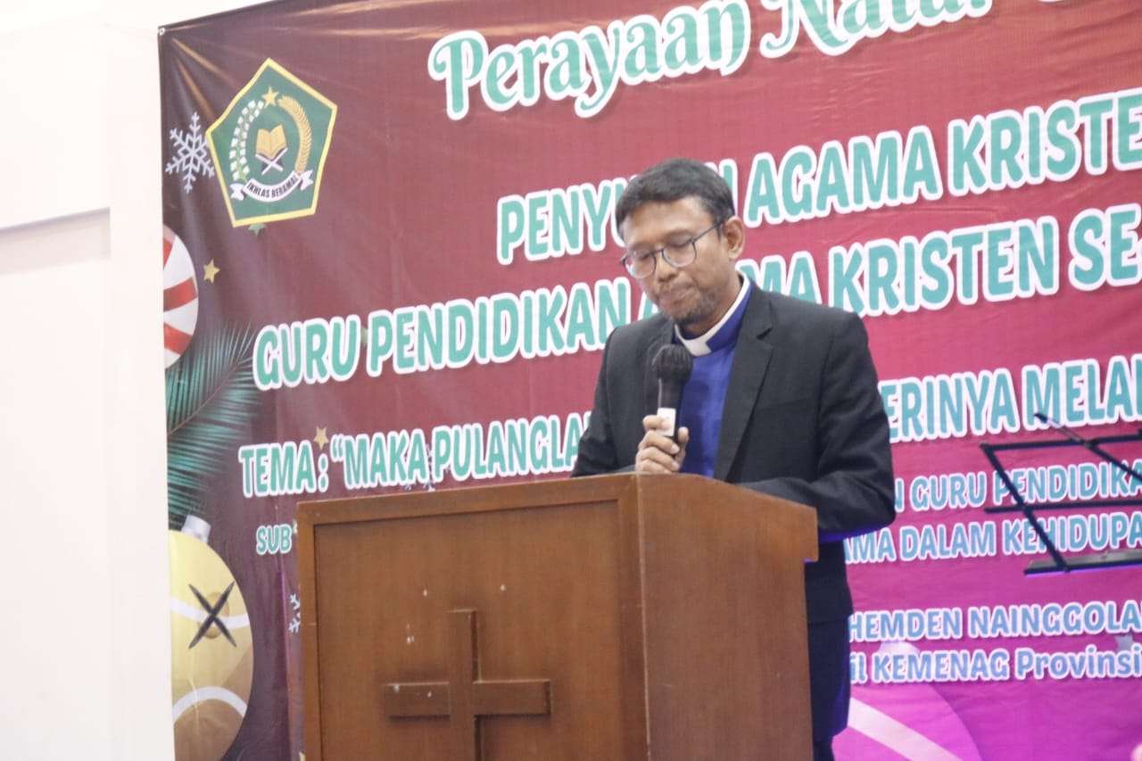 Tema yang diambil dalam perayaan ini “Maka Pulanglah mereka ke negerinya melalui jalan lain (Matius 2:12), dengan mengambil sub tema ” Melalui Natal, Penyuluh Agama Kristen dan Guru Pendidikan Agama Kristen Berperan Serta Mengembangkan Moderasi Beragama dalam kehidupan umat Kristiani.”