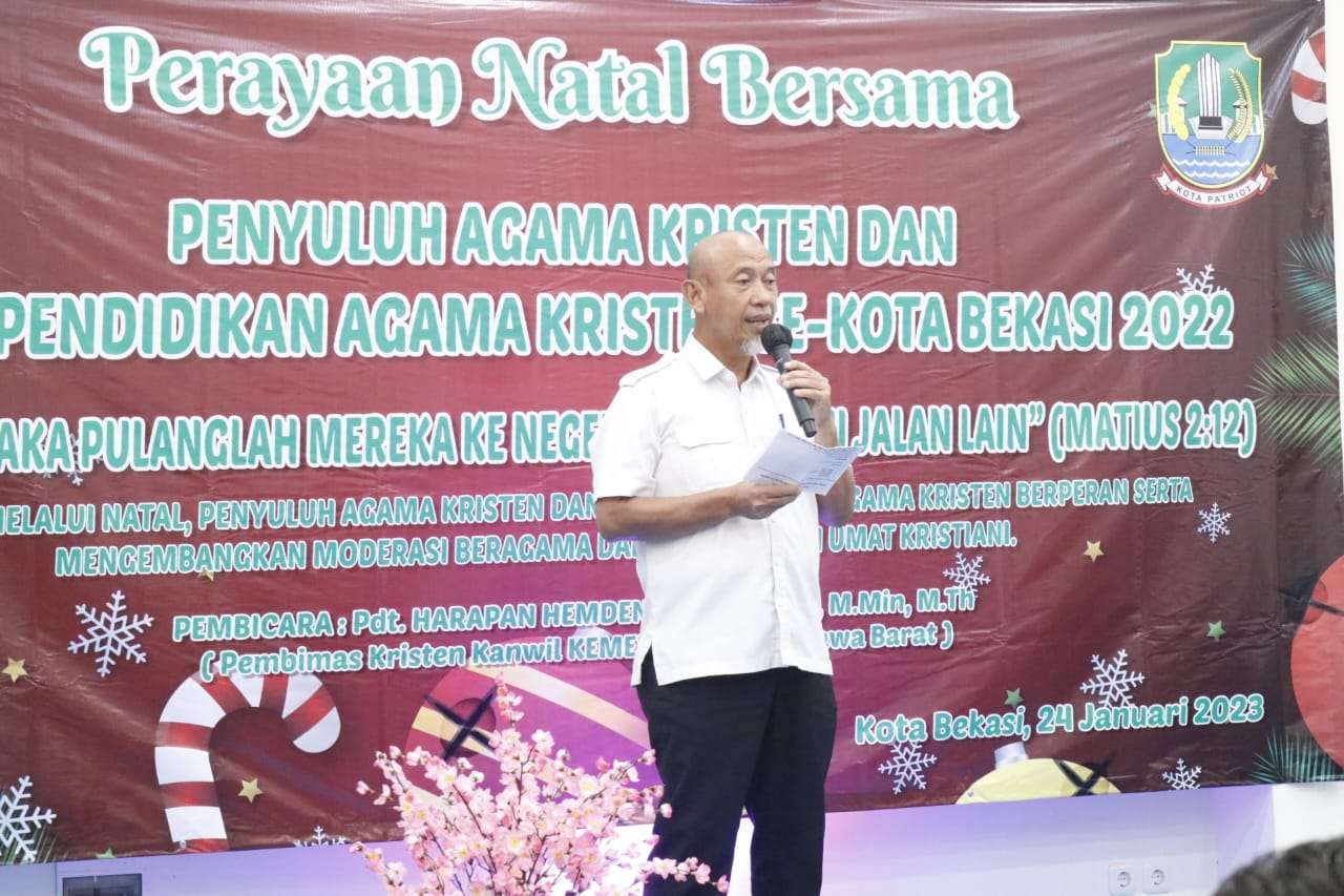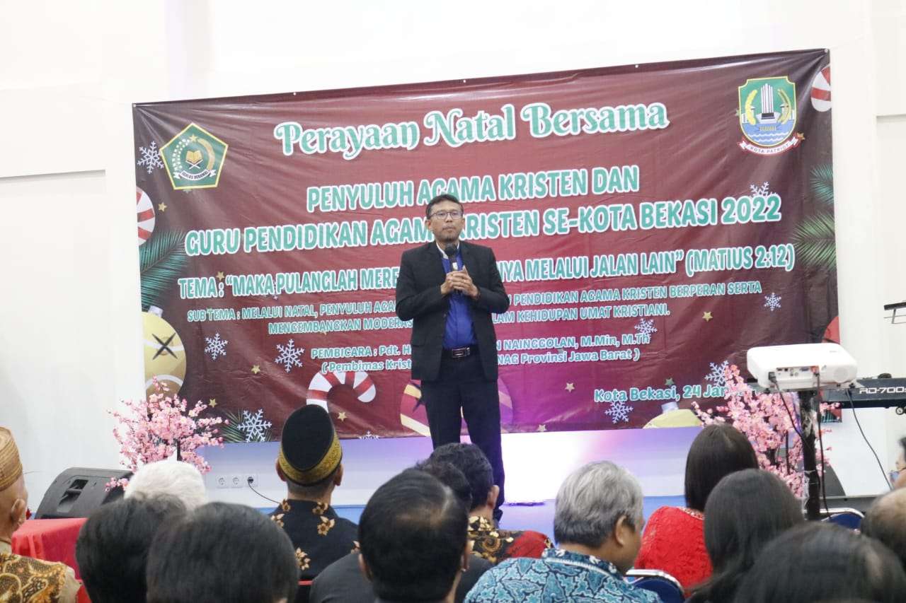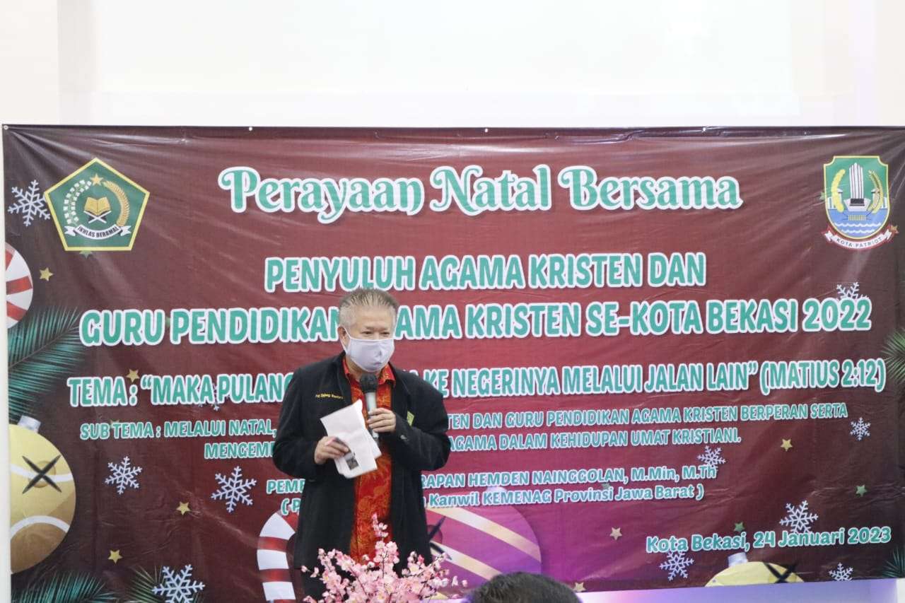 Acara dihadiri oleh para guru dan penyuluh Agama Kristen se Kota Bekasi. Sebagai Pembicara dalam perayaan natal tersebut Pdt. Harapan Hemden Nainggolan, M. Min., M.Th. (Pembimas Kristen Kanwil Kementerian Agama Provinsi Jawa Barat).