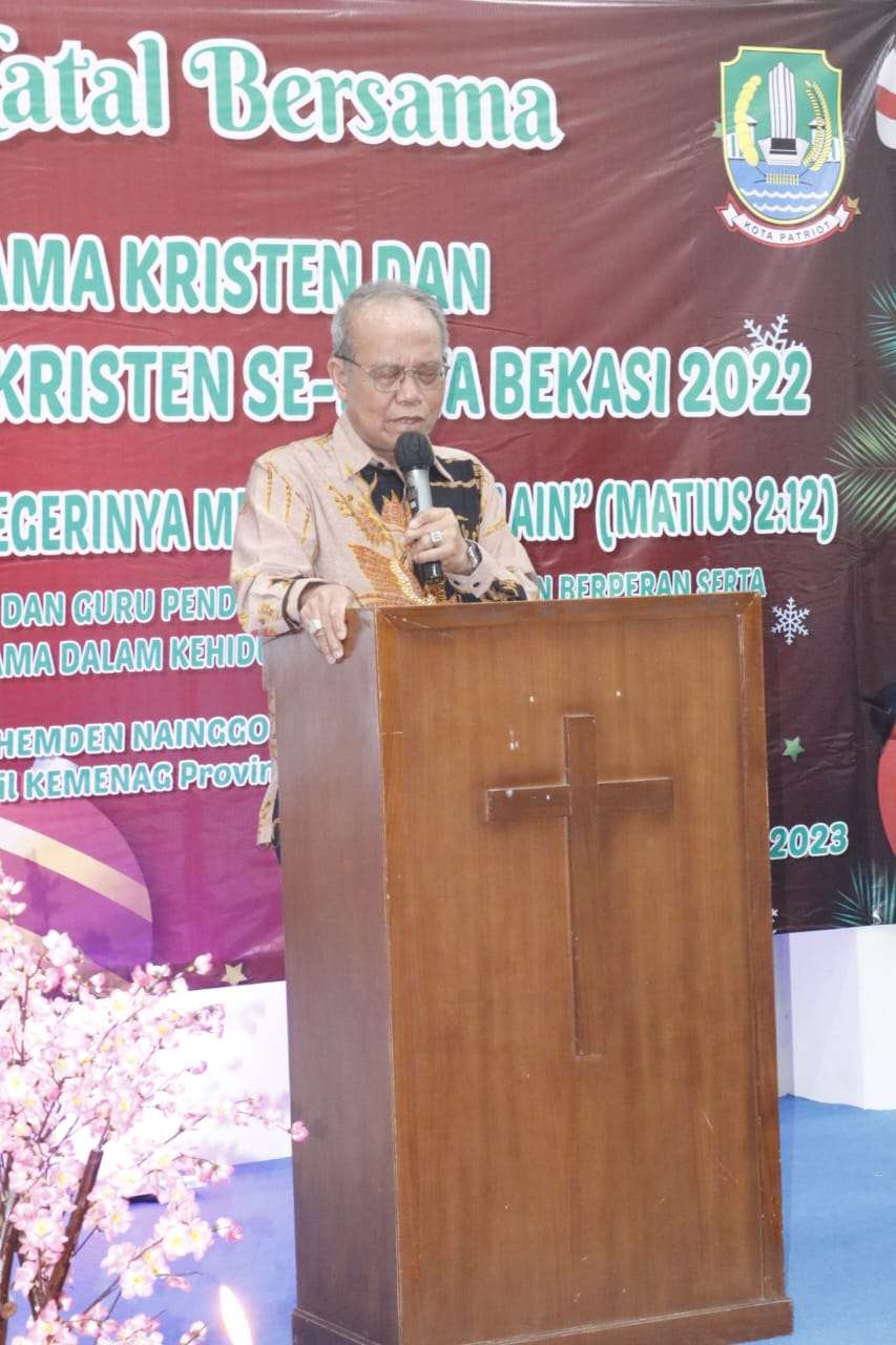 Kaban Kesbangpol Cecep Suherlan yang mewakili Plt Walikota Bekasi mengatakan, “Pemerintah kota Bekasi sangat memberikan apresiasi dalam perayaan Natal ini. Bahkan pak Plt Walikota Bekasi memberikan hadiah bagi guru dan penyuluh berupa sepeda 2 buah. Kita mengetahui kota Bekasi selalu mendapatkan prestasi dalam hal kota yang menjaga dan menjunjung tinggi toleransi beragama. Oleh karena itu, mari kita jaga bersama keragaman ini dengan saling menghargai, membantu dan mendukung dalam membangun kota kita Bekasi yang tercinta ini, ” Pungkas Cecep.