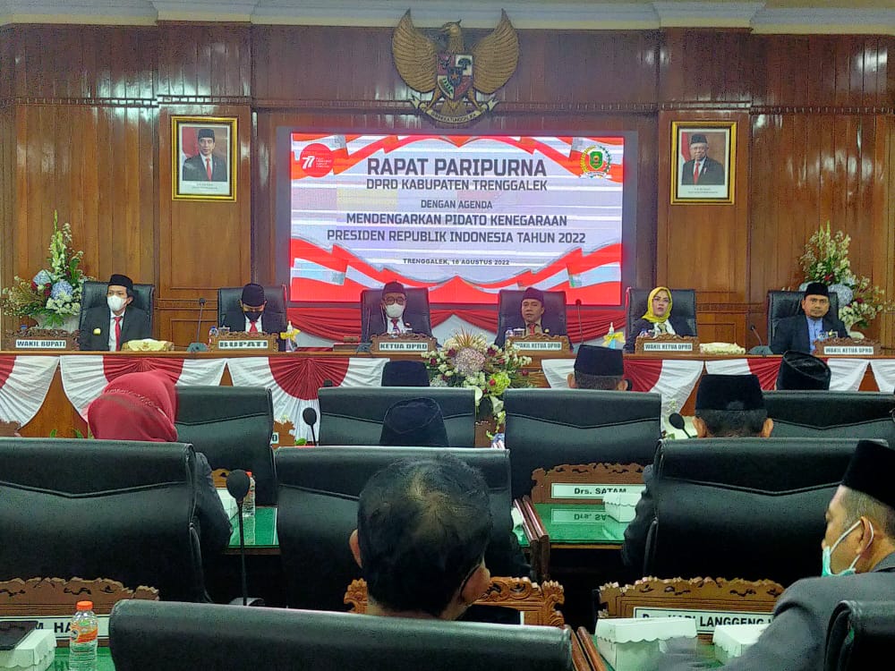 Trenggalek – Peringati Hari kemerdekaan indonesia yang ke-77 DPRD Trenggalek adakan rapat paripurna dengan mengundang beberapa OPD dalam rangka mendengarkan pidato kenegaraan presiden republik indonesia tahun 2022 Di ruang graha paripurna DPRD Kabupaten Trenggalek. Selasa (16/08/2022)