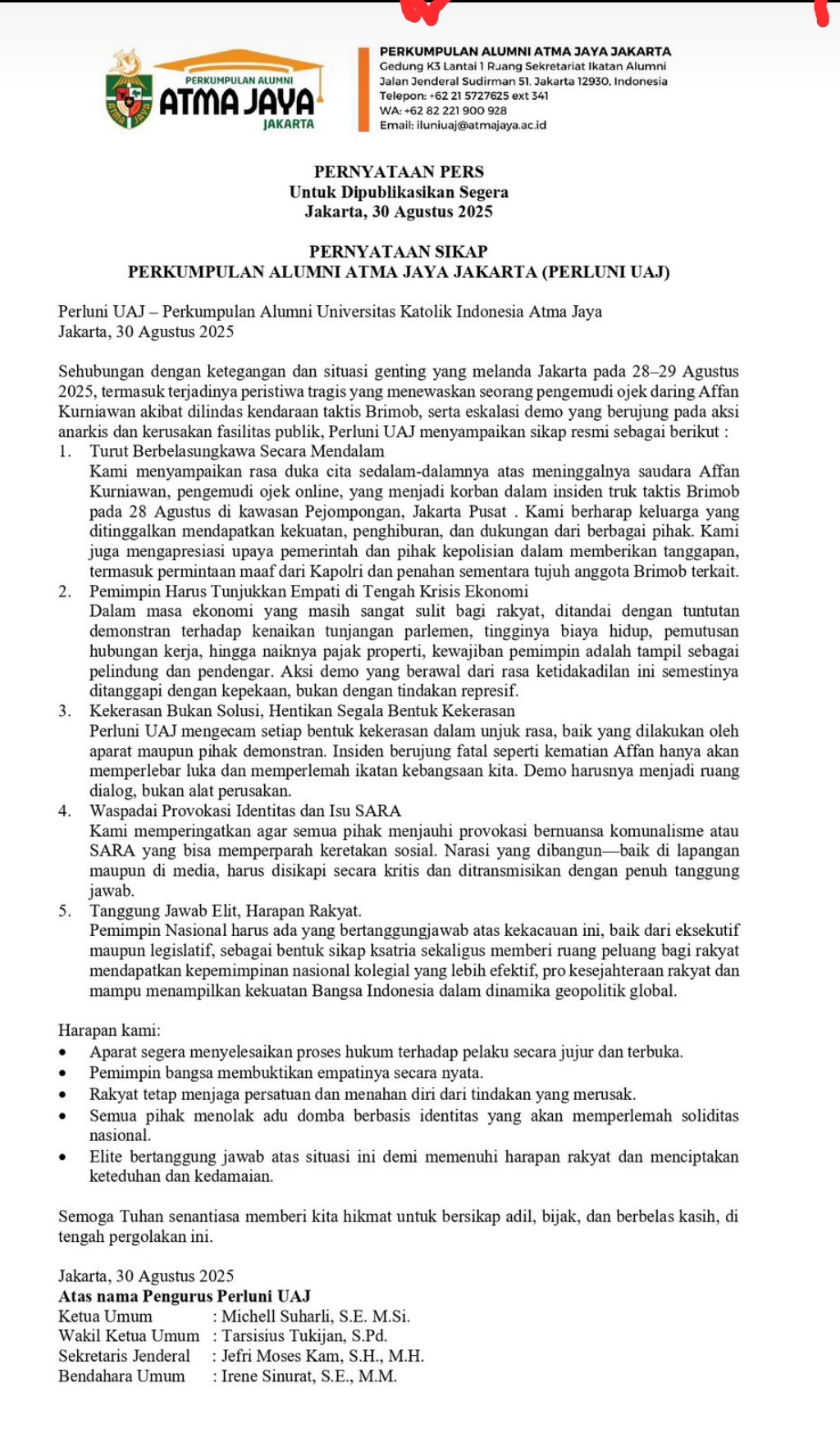 Jakarta,31 Agustus 2025 – Perkumpulan Alumni Universitas Katolik Indonesia Atma Jaya Jakarta (Perluni UAJ) menyampaikan sikap resmi terkait ketegangan dan situasi genting yang melanda Jakarta pada 28-29 Agustus 2025, termasuk peristiwa tragis yang menewaskan seorang pengemudi ojek daring Affan Kurniawan akibat dilindas kendaraan taktis Brimob.