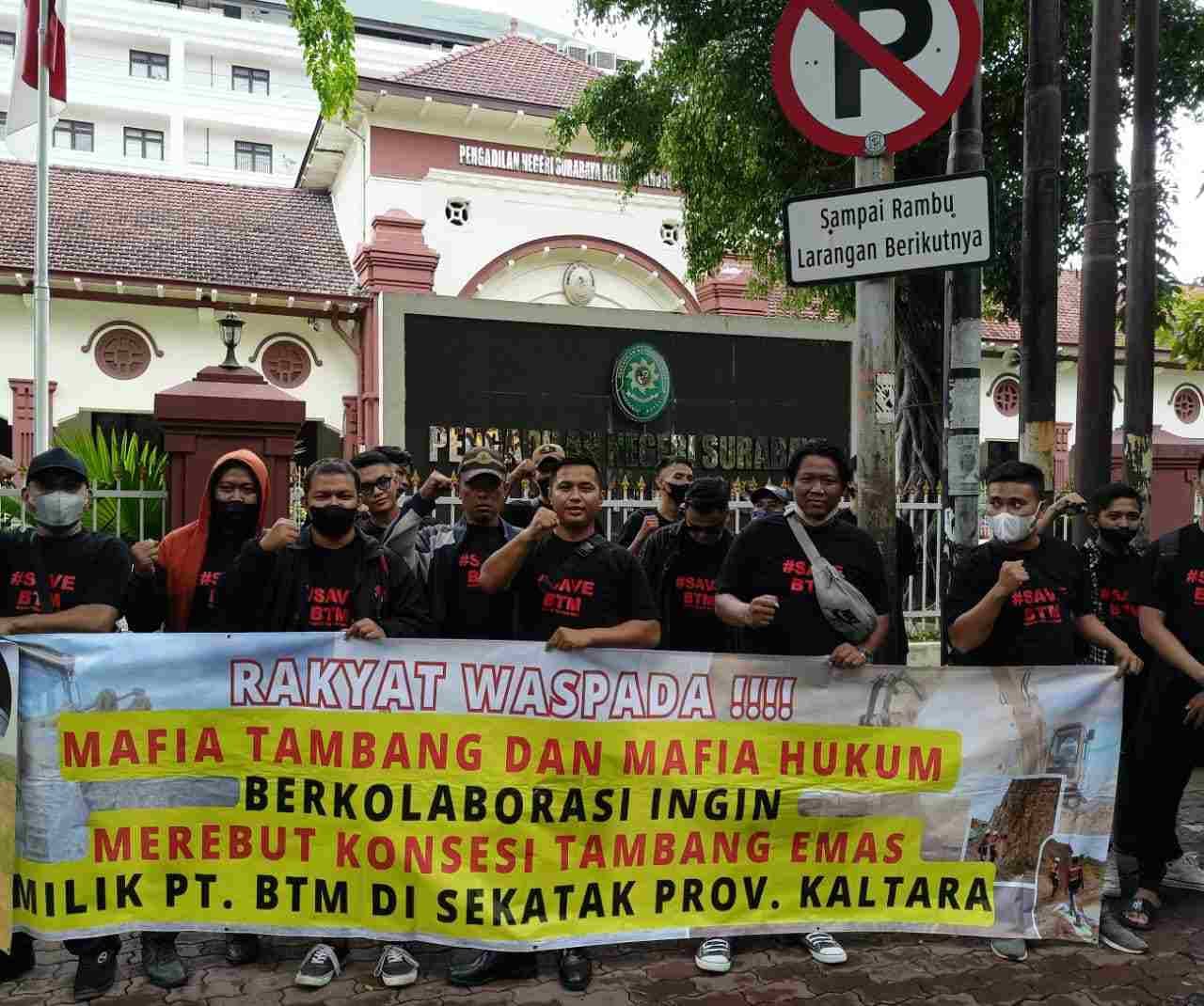 Puluhan massa menggelar aksi kewaspadaan terhadap mafia tambang di depan PN Surabaya saat sidang permohonan PKPU pertama terhadap PT BTM/ Istimewa