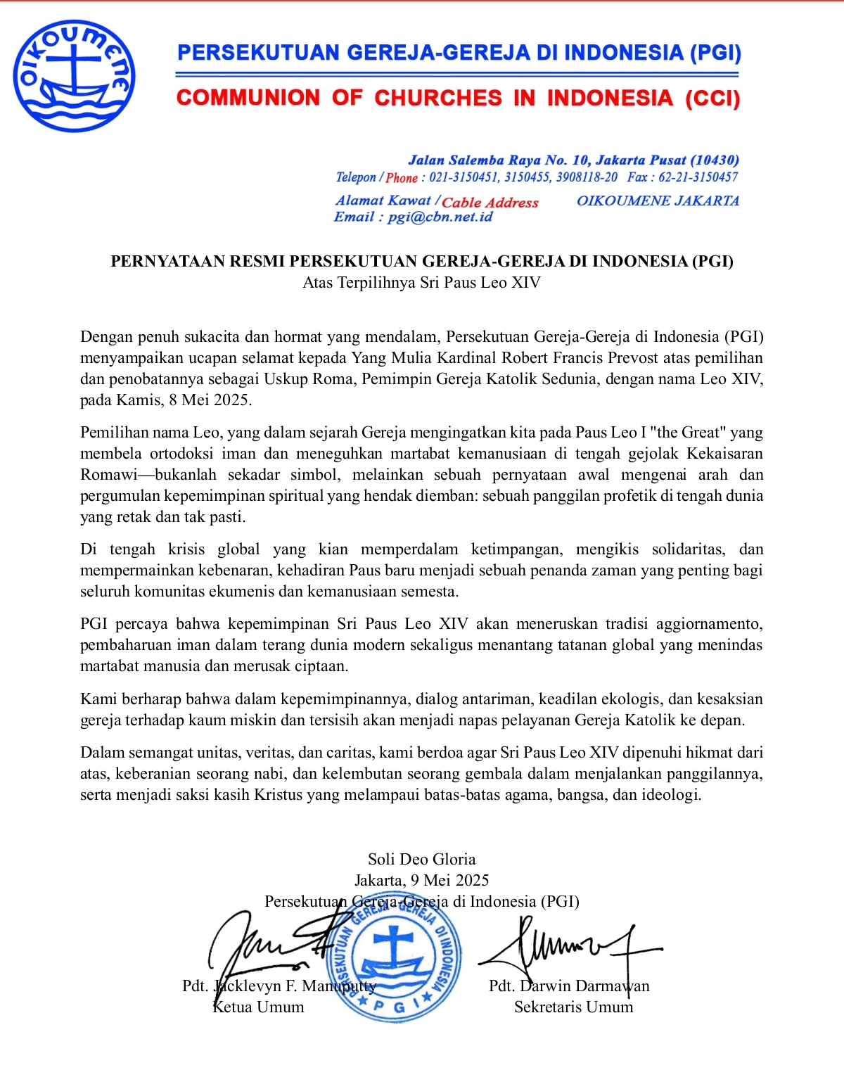 JPN Dengan penuh sukacita dan hormat yang mendalam, Persekutuan Gereja-Gereja di Indonesia (PGI) menyampaikan ucapan selamat kepada Yang Mulia Kardinal Robert Francis Prevost atas pemilihan dan penobatannya sebagai Uskup Roma, Pemimpin Gereja Katolik Sedunia, dengan nama Leo XIV,pada Kamis, 8 Mei 2025.