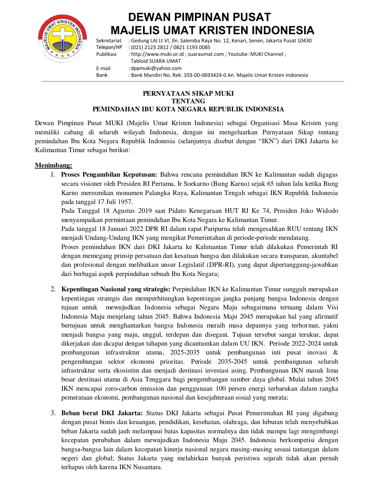 Dengan mempertimbangkan poin – poin tersebut maka Dewan Pimpinan Pusat Majelis Umat Kristen Indonesia (MUKI) dengan ini membuat PERNYATAAN SIKAP tentang pemindahan Ibu Kota Negara Republik Indonesia sebagai berikut :