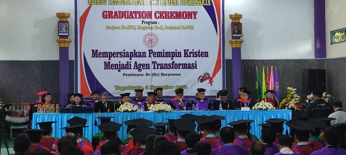 Pelaksanaan Prosesi Wisuda Sarjana ke XVII, Magister ke-X dan Doktoral ke-VIII STT KADESI Yogyakarta, di digelar secara langsung, setelah dua tahun aktifitas akademik terhambat karena pandemi covid-19, tema wisuda tahun 2022 yaitu “Mempersiapkan Pemimpin Kristen Menjadi Agen Transformasi” bertempat di Kampus STT KADESI Yogyakarta, Umbulharjo, Kapanewon Cangkringan, Sleman, Daerah Istimewa Yogyakarta, Kamis (3/11/2022).