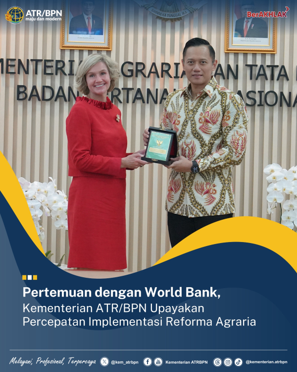 World Bank Country Director for Indonesia and Timor Leste, Satu Kahkonen menyebut bahwa kerja sama World Bank dengan Pemerintah RI bisa disebut amat sukses dengan capaian hasil yang begitu signifikan. Di kesempatan ini, ia mendukung inisiasi Kementerian ATR/BPN yang ingin menerapkan implementasi pertanahan dan tata ruang yang lebih pro lingkungan. “Hal ini bisa dimulai dari bisnis prosesnya. Bisnis proses apa yang dapat dilakukan yang berhubungan dengan dukungan kepada penanganan perubahan iklim,” jelasnya.